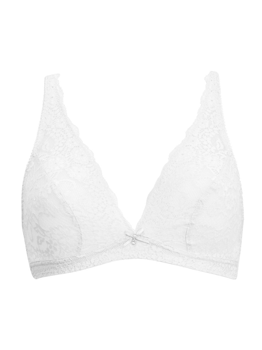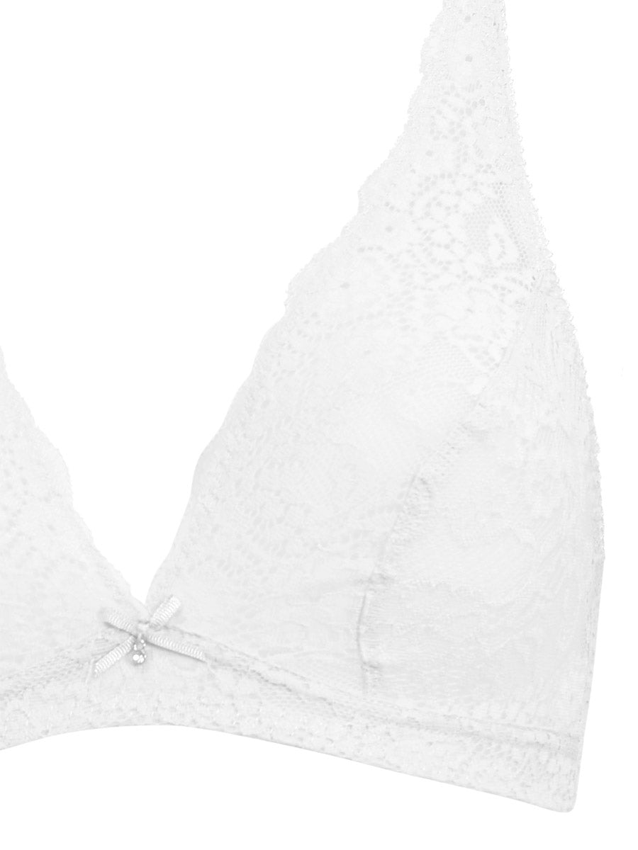 Reggiseno a triangolo senza ferretto realizzato in raffinato laize di pizzo stretch con cordonetto in rilievo a motivo floreale e impreziosito da un galloncino sempre in pizzo. Malizioso gioco di trasparenze e cuciture diagonali sulle coppe per garantire massima vestibilità. Dettaglio a centroseno di fiocchetto in raso e gioiello con punto luce.