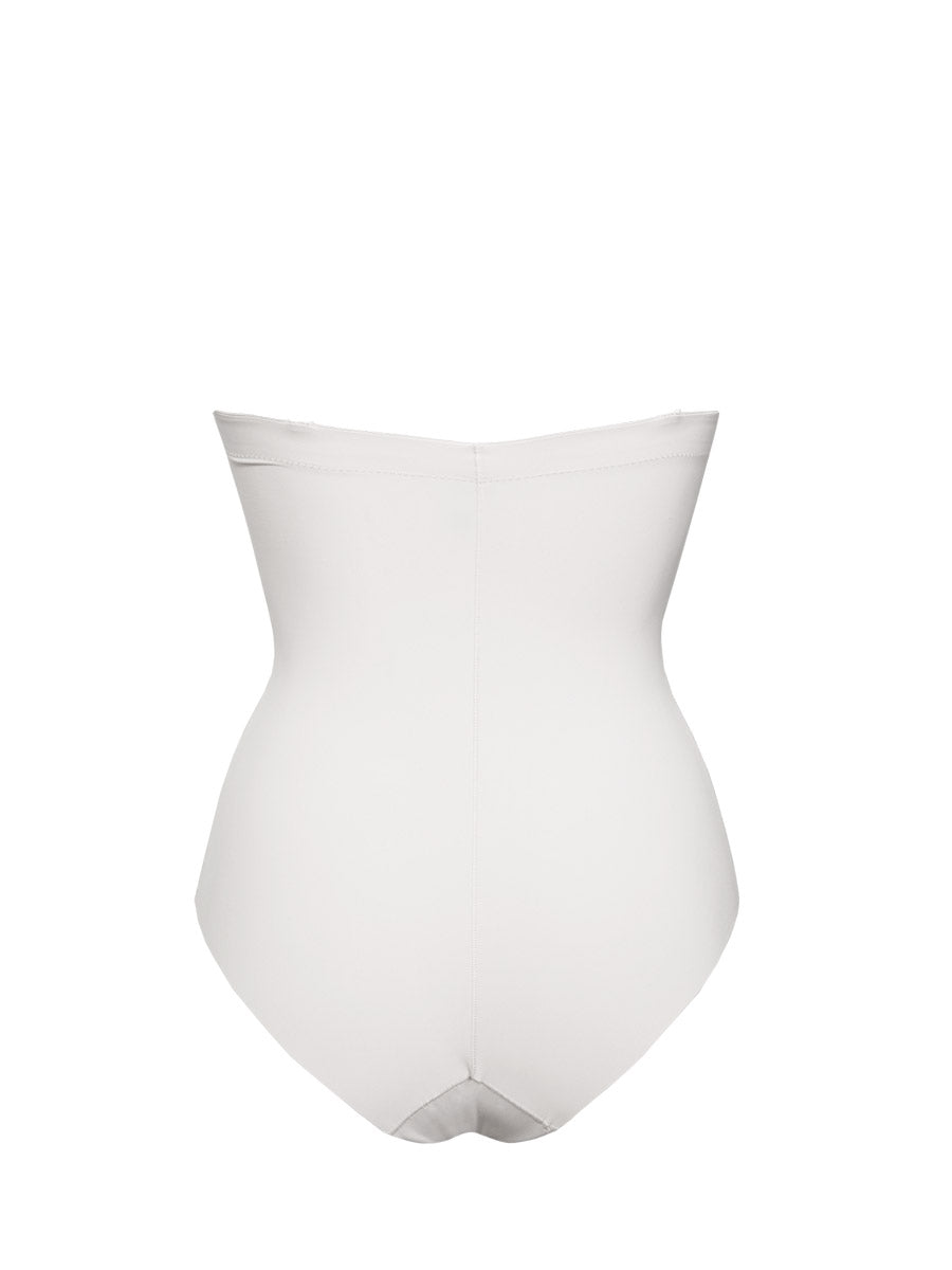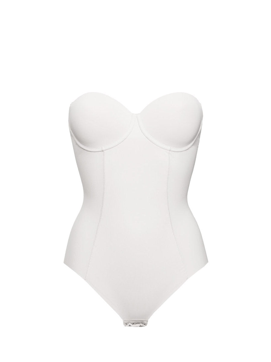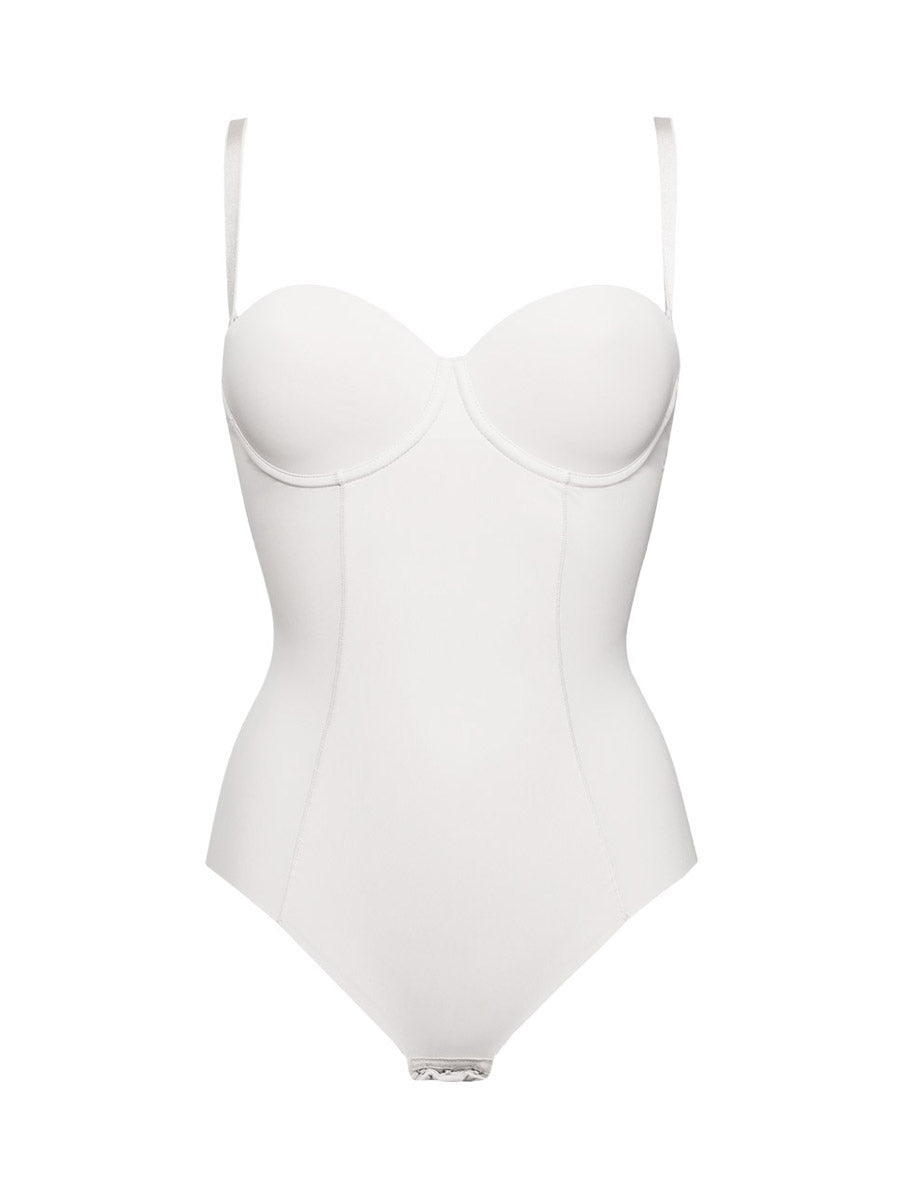 Body a fascia con ferretto, coppe imbottite e spalline removibili, realizzato in microfibra stretch delicatamente contenitiva. Il modello è caratterizzato dal pannello frontale doppiato per assicurare un maggiore effetto shaping, taglio laser sulle sgambature e profonda scollatura sulla schiena.