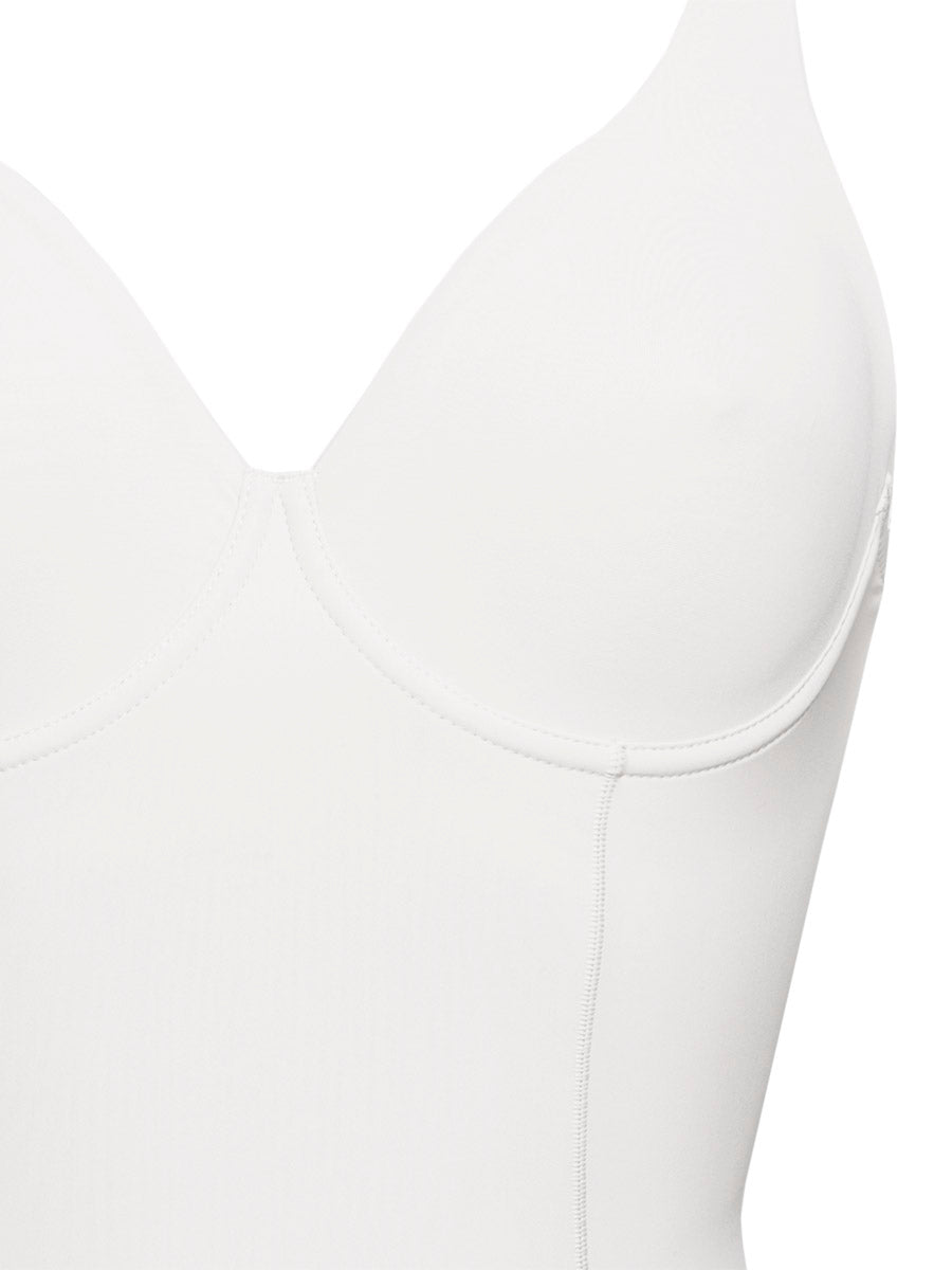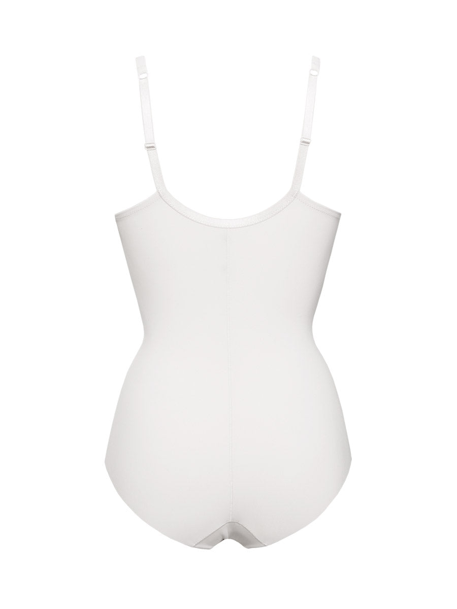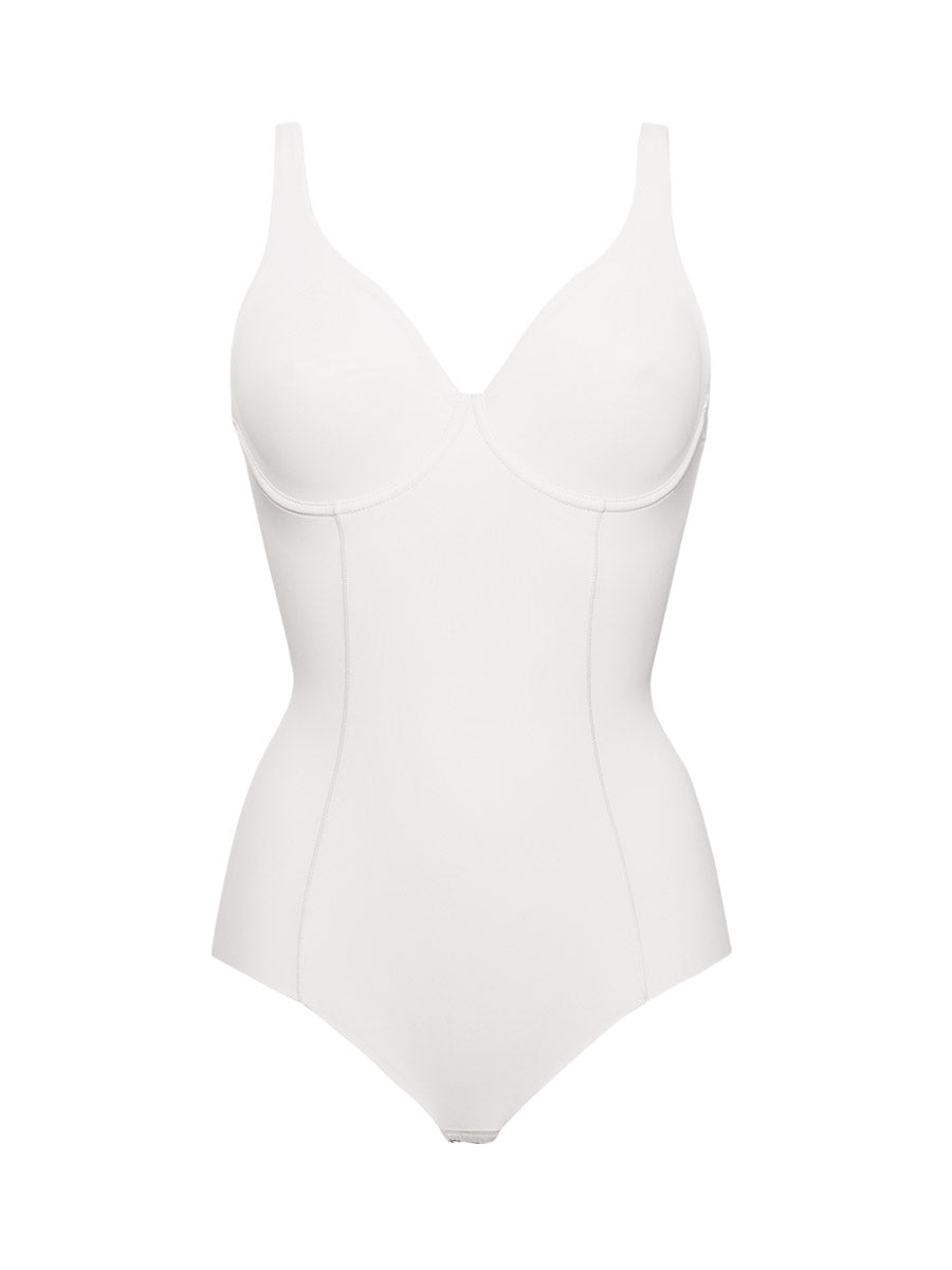 Body francese con ferretto realizzato in microfibra stretch delicatamente contenitiva con pannello frontale doppiato per assicurare un maggiore effetto shaping e taglio laser sulle sgambature per passare inosservato sotto agli abiti più attillati.