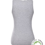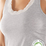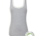 Canotta con spalla larga e scollo tondo bordato di pizzo, in cotone bio. Morbida, confortevole e disponibile in 5 colori