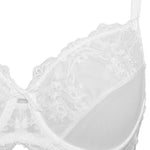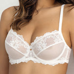 Un reggiseno francese con ferretto che crea un gioco di trasparenze accompagnando le forme femminili ed esaltandole. Realizzato in raffinato tulle stretch ricamato. Un modello dallo stile retrò che garantisce un ottimo sostegno e comfort anche per le coppe differenziate C e D. Spesse spalline regolabili e delicato fiocchetto in centroseno ton sur ton