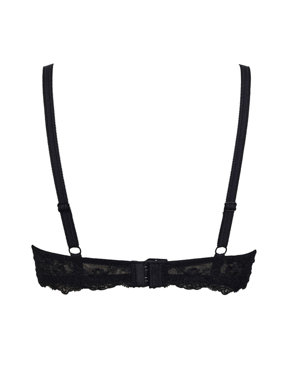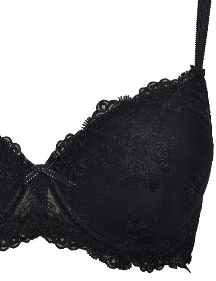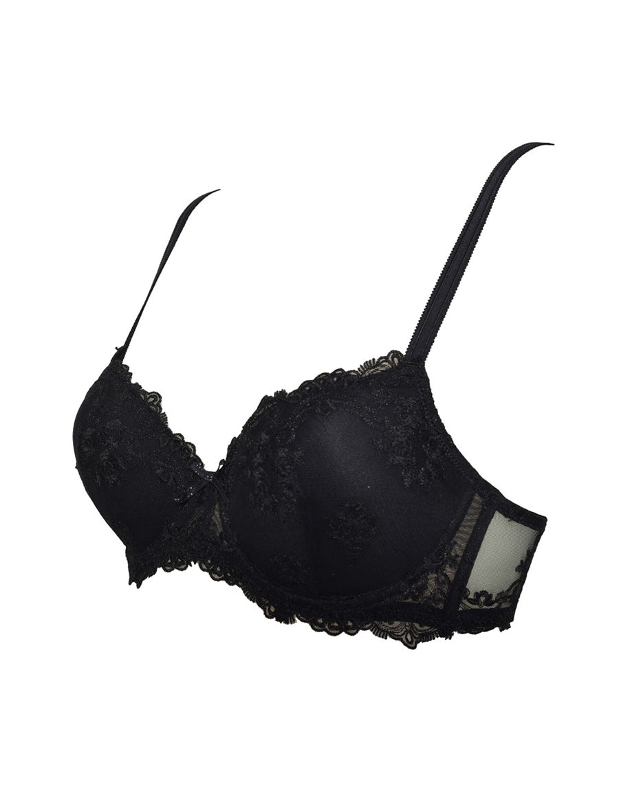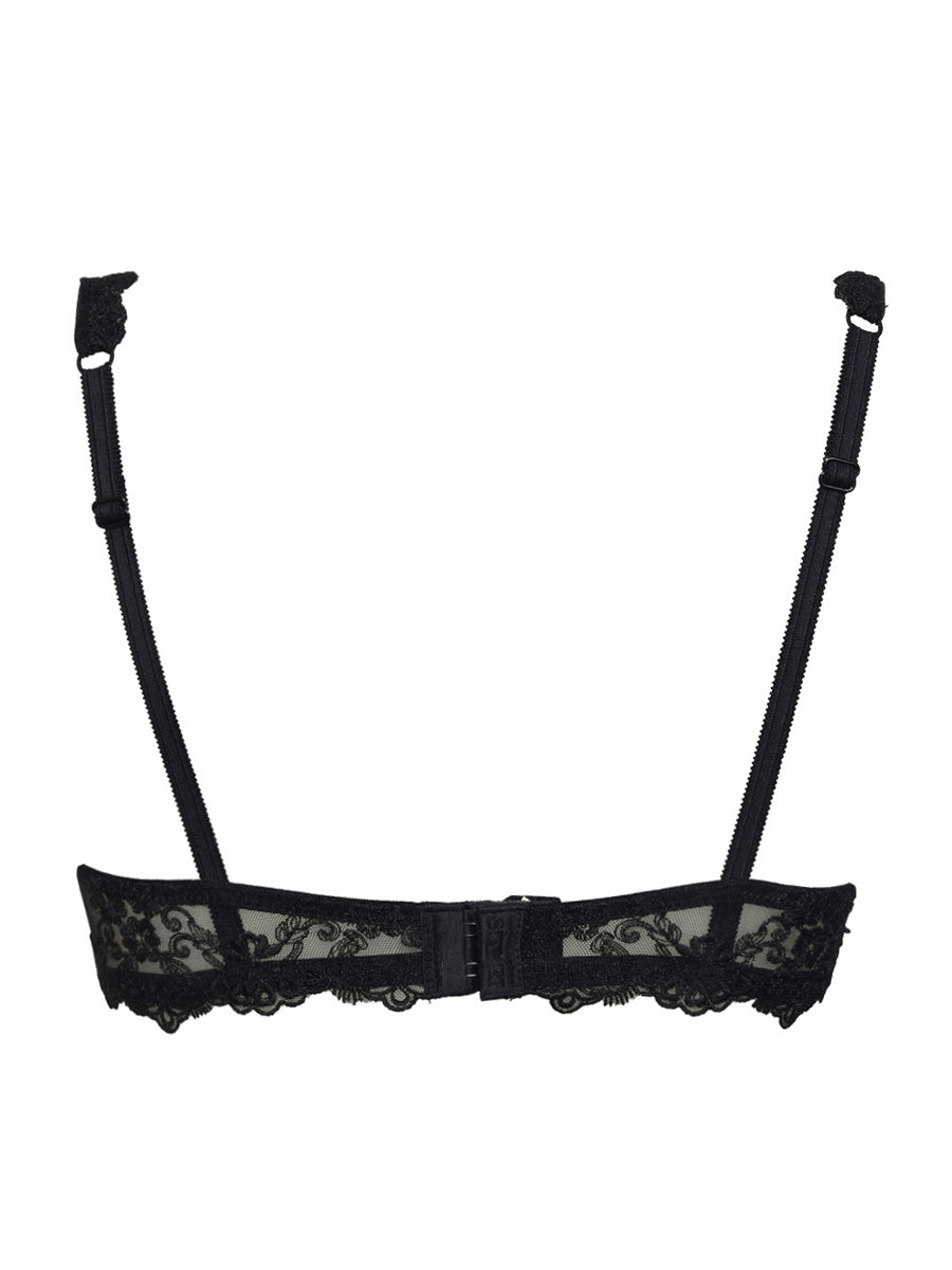 Di assoluta tendenza la bralette con ferretto e coppe imbottite, interamente realizzata in seducente tulle stretch dal prezioso motivo floreale. Spalline regolabili e fiocchetto in centroseno ton sur ton.