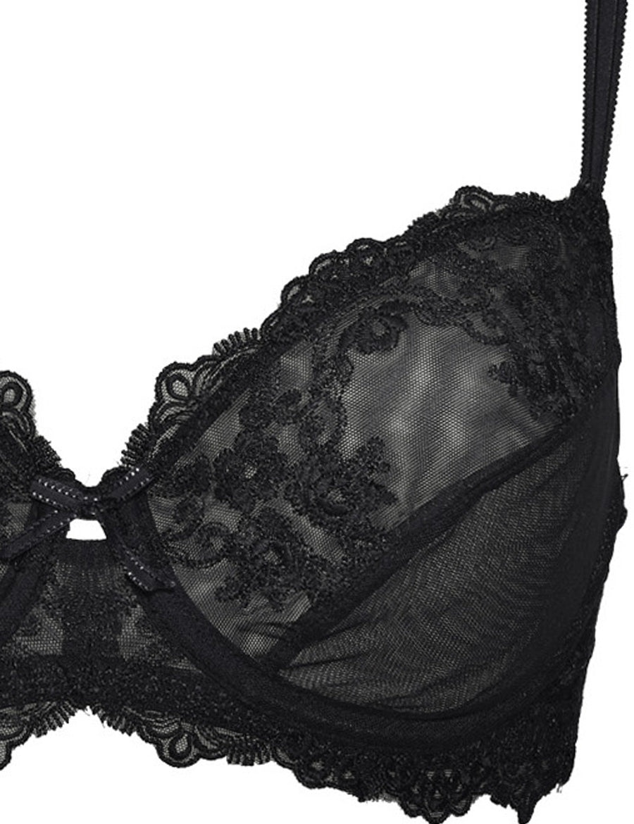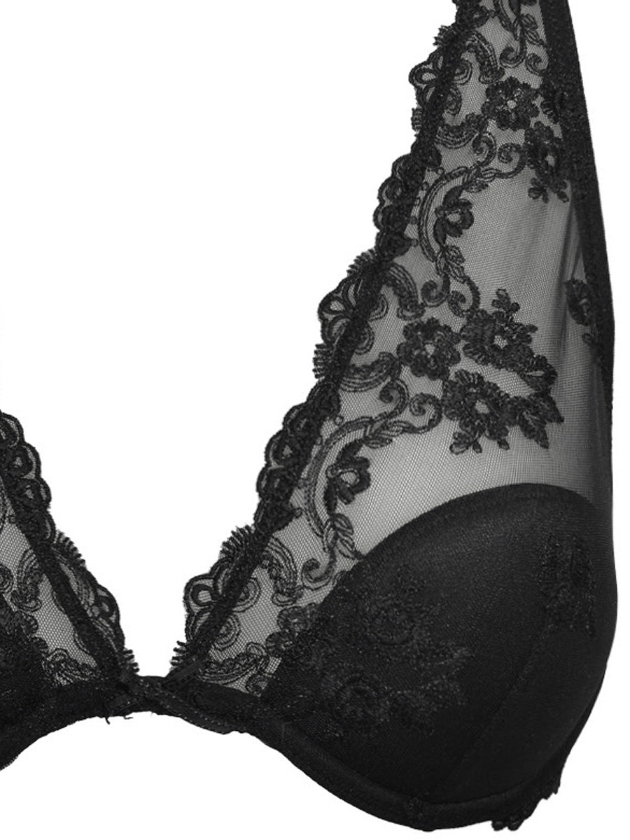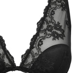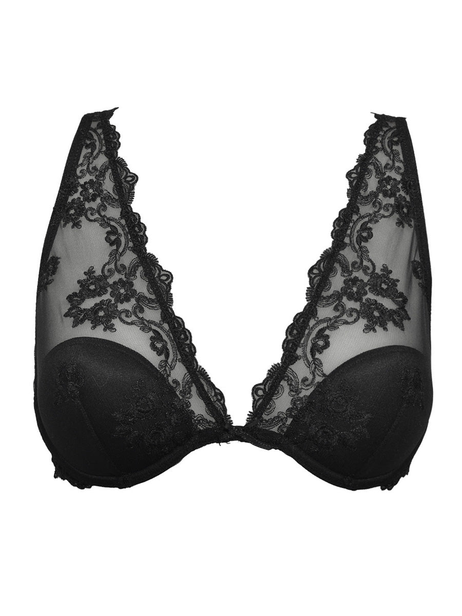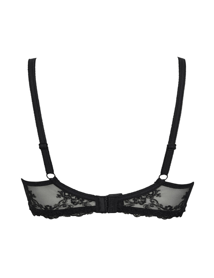 Di assoluta tendenza la bralette con ferretto e coppe imbottite, interamente realizzata in seducente tulle stretch dal prezioso motivo floreale. Spalline regolabili e fiocchetto in centroseno ton sur ton.