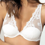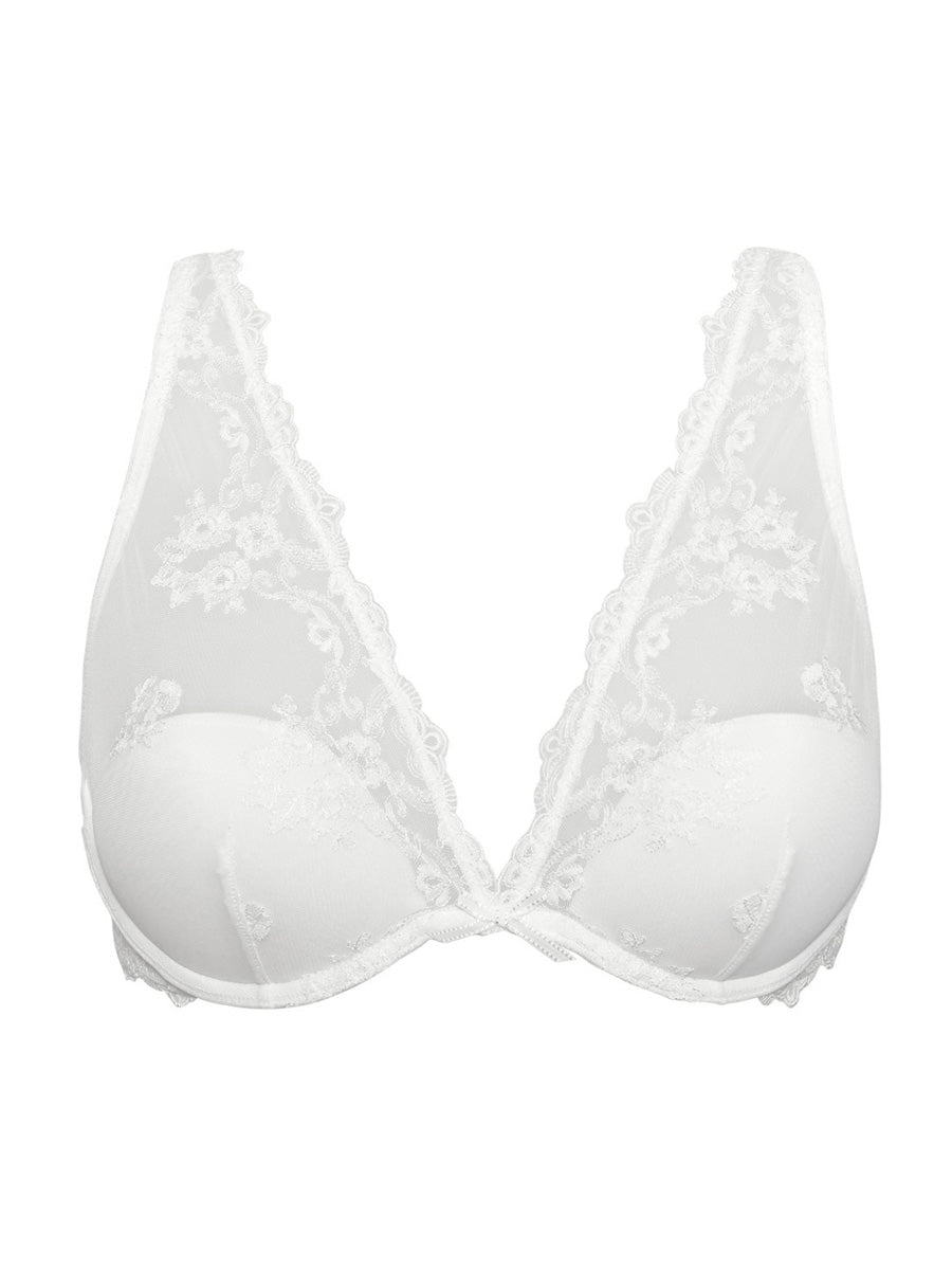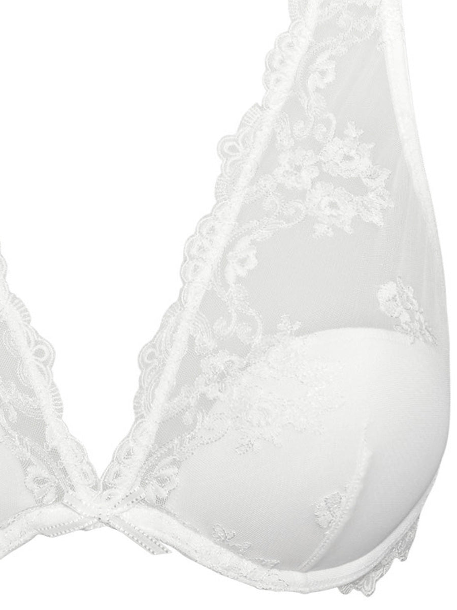Di assoluta tendenza la bralette con ferretto e coppe imbottite, interamente realizzata in seducente tulle stretch dal prezioso motivo floreale. Spalline regolabili e fiocchetto in centroseno ton sur ton.