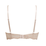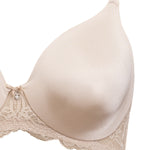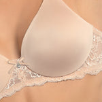 Reggiseno francese con ferretto realizzato in microfibra stretch semilucida abbinata ad un raffinato pizzo floreale. Modello con stecche laterali. Fiocchetto in raso con punto luce applicato al centro