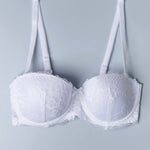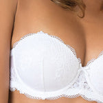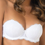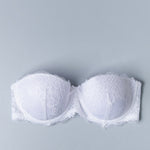 Fascia interamente realizzata in pizzo con coppe imbottite, ferretto e spalline removibili. Modello con stecche laterali e profili in silicone per assicurare ottima vestibilità anche senza spalline.