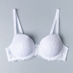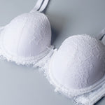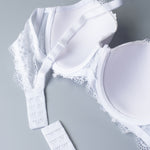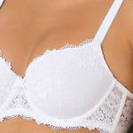 Un gioiello di pizzo, tutto da indossare. Reggiseno in total lace, con ferretto e coppe imbottite, con stecche laterali per assicurare ottima vestibilità anche alle coppe differenziate (disponibile dalla B alla E). Rifinito con fiocchetto in gros-grain a centroseno. Regolatore supplementare per torace incluso.