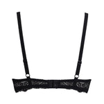 Reggiseno con coppe graduate e senza ferretto, realizzato in raffinata balza di pizzo con motivo floreale. Torace e centroseno in laize di pizzo con spalline regolabili. Dettaglio a centroseno di fiocchetto in raso con gioiello e punto luce