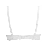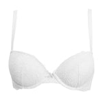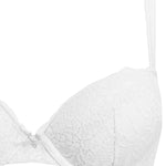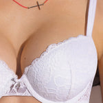 Reggiseno push-up con ferretto e coppe graduate, realizzato in raffinata balza di pizzo stretch con cordonetto in rilievo a motivo floreale ed impreziosito da un galloncino sempre in pizzo. Torace in laize di pizzo con spalline regolabili. Dettaglio a centroseno di fiocchetto in raso con gioiello e punto luce
