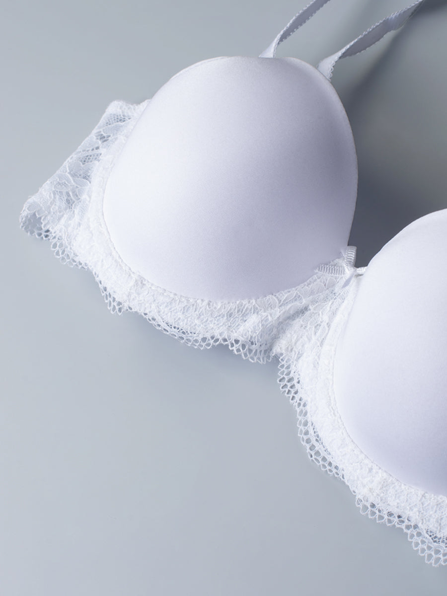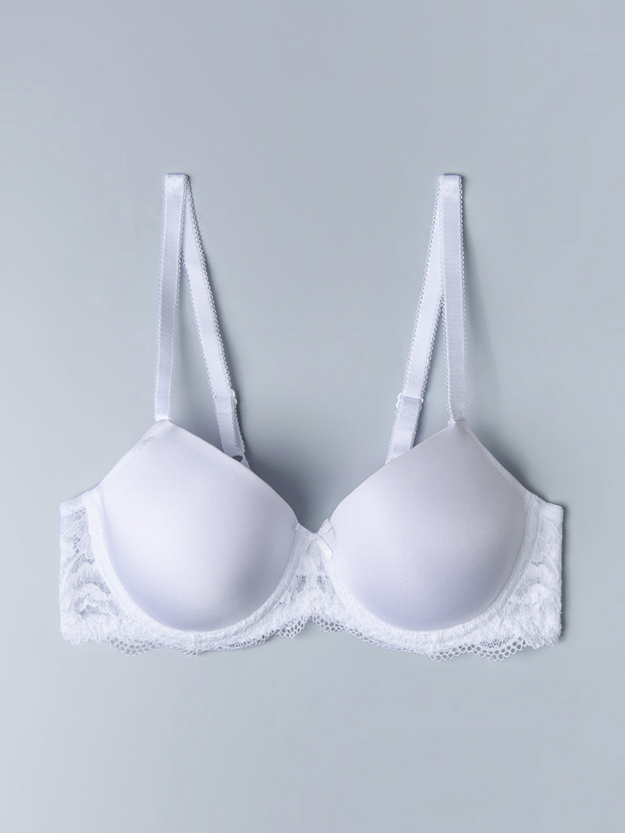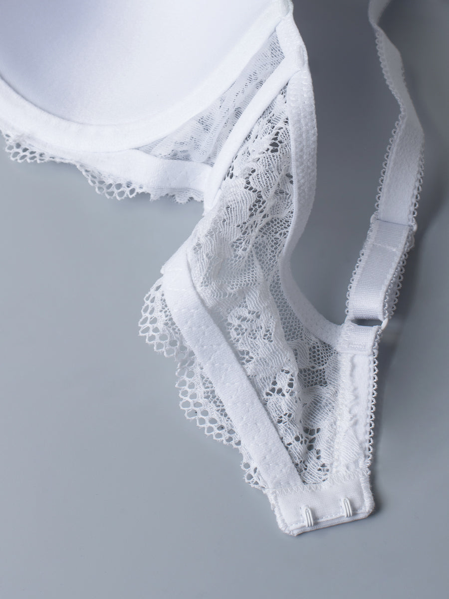 Reggiseno con ferretto e coppe imbottite realizzato in soffice microfibra e pizzo in tono. Un modello altamente confortevole, studiato per assicurare ottima vestibilità per coppe differenziate (disponibile fino alla E), senza rinunciare allo stile ed un tocco di femminilità. Rifinito con fiocchetto in gros-grain a centroseno. Regolatore supplementare per torace incluso.