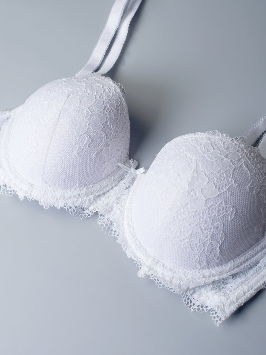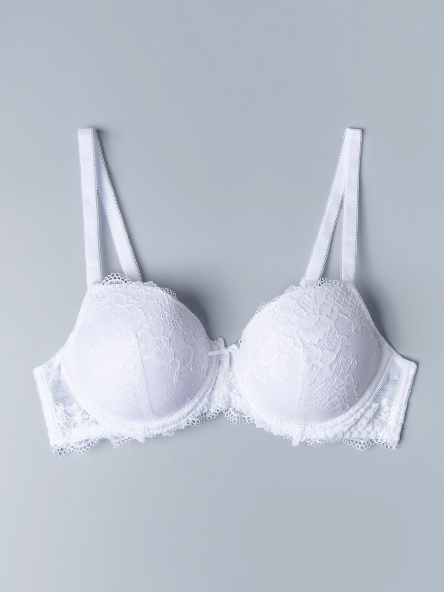 Un gioiello di pizzo, tutto da indossare. Reggiseno in total lace, con ferretto e coppe imbottite, con stecche laterali per assicurare ottima vestibilità anche alle coppe differenziate (disponibile dalla B alla E). Rifinito con fiocchetto in gros-grain a centroseno. Regolatore supplementare per torace incluso.