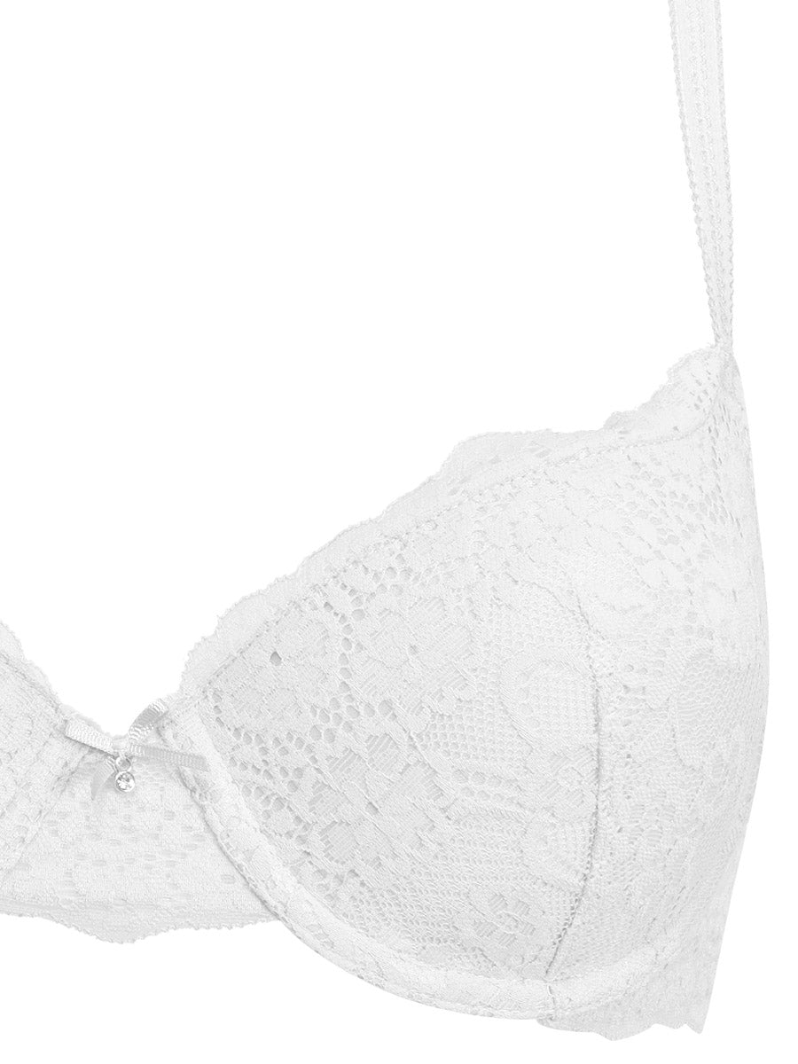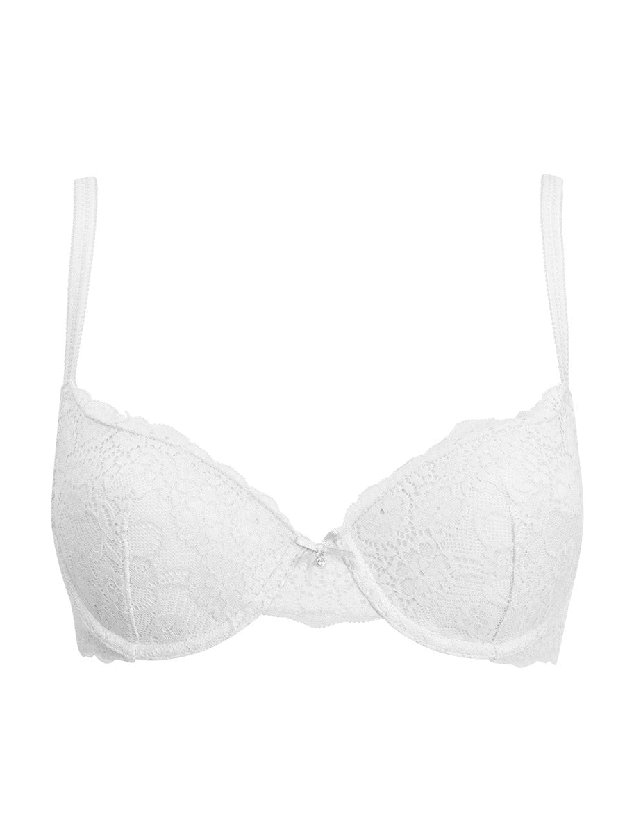 Reggiseno imbottito con ferretto, realizzato in raffinata balza di pizzo con cordonetto in contrasto a motivo floreale. Torace in laize di pizzo stretch e spalline regolabili. Dettaglio a centroseno di fiocchetto di raso con gioiello e punto luce.