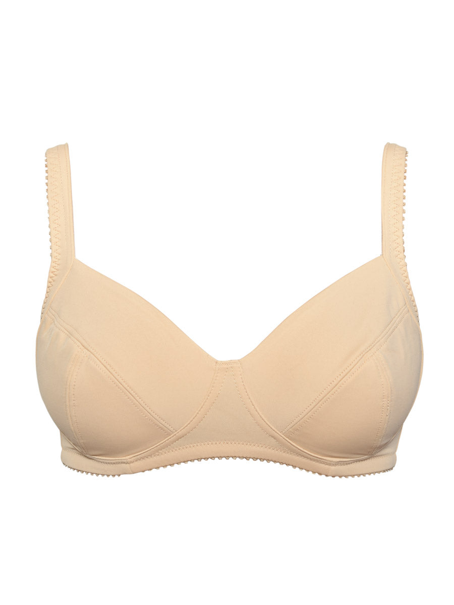 Reggiseno classico senza ferretto in microfibra stretch liscia. La realizzazione delle coppe con riprese, le doppiature interne in cotone ed il tessuto particolarmente sostenuto ne fanno un capo adatto alle curve più generose, senza il fastidio del ferretto.