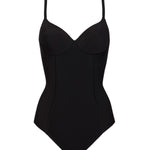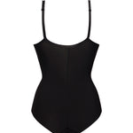 Body con coppe imbottite e ferretto invisibile, realizzato in microfibra stretch delicatamente contenitiva. Il modello è caratterizzato dal pannello frontale doppiato per assicurare un maggiore effetto shaping, taglio laser sulle sgambature e spalline regolabili.