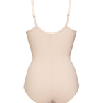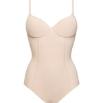 Body con coppe imbottite e ferretto invisibile, realizzato in microfibra stretch delicatamente contenitiva. Il modello è caratterizzato dal pannello frontale doppiato per assicurare un maggiore effetto shaping, taglio laser sulle sgambature e spalline regolabili.