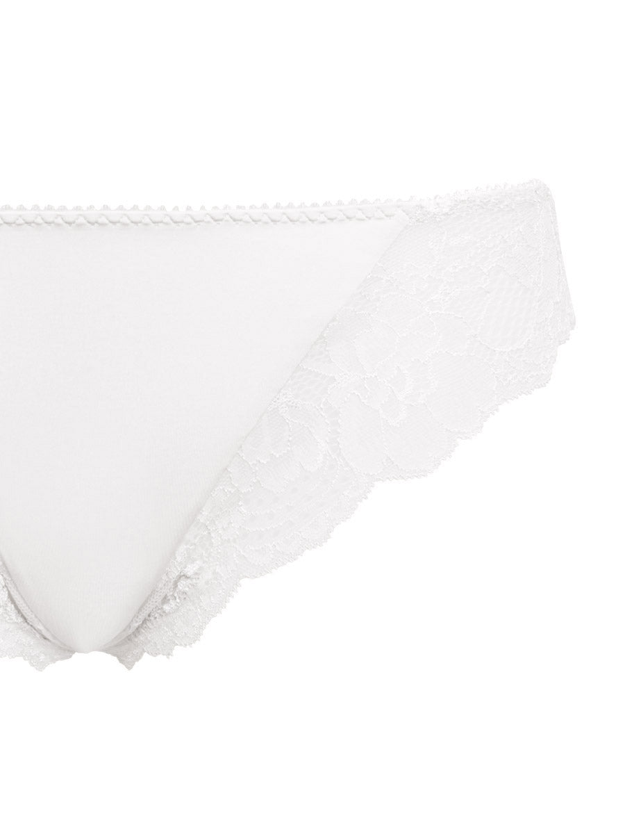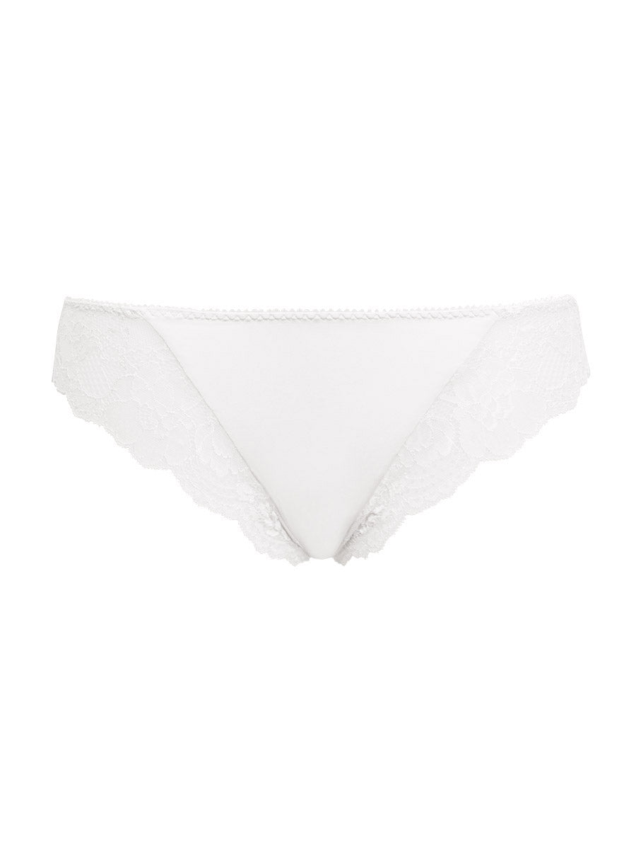 Brasiliana in microfibra stretch semilucida abbinata ad un raffinato pizzo floreale. Dettaglio di fiocchetto in raso