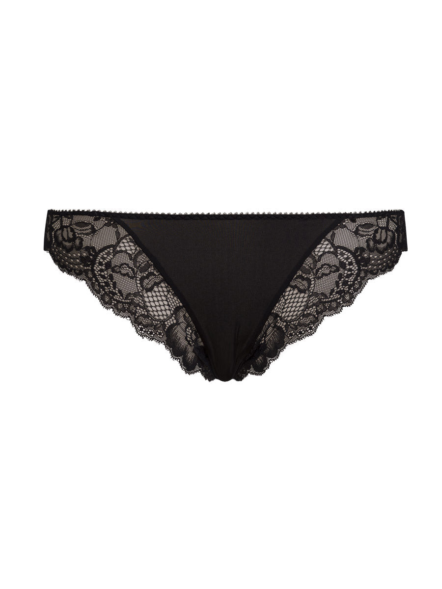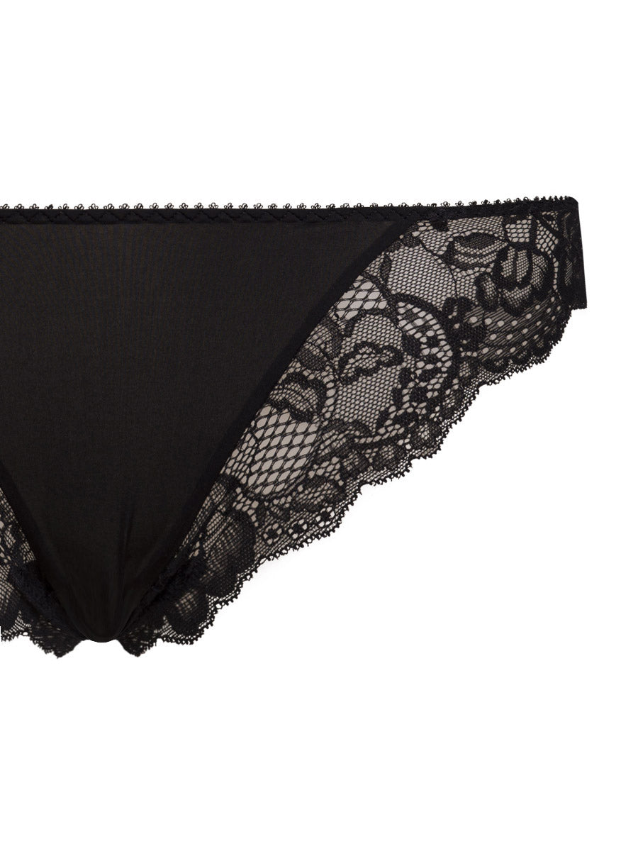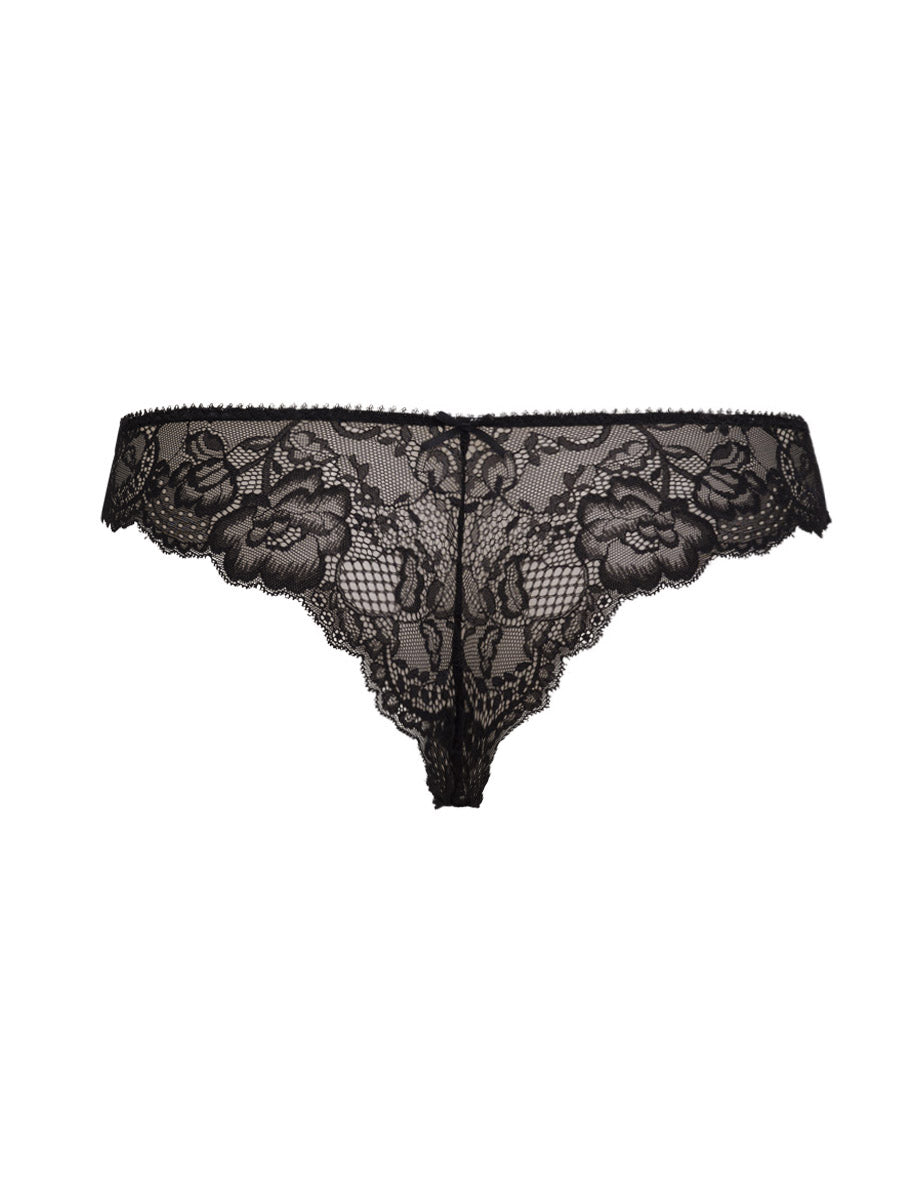 Brasiliana in microfibra stretch semilucida abbinata ad un raffinato pizzo floreale. Dettaglio di fiocchetto in raso