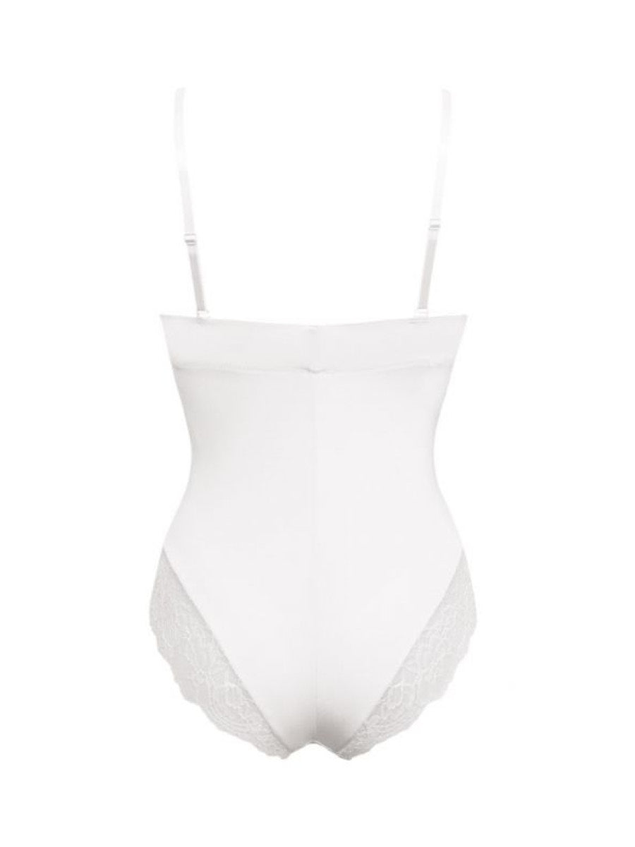 Body con ferretto e coppe graduate realizzato in microfibra stretch semilucida abbinata ad un raffinato pizzo floreale. Modello con spalline removibili e profonda scollatura sulla schiena