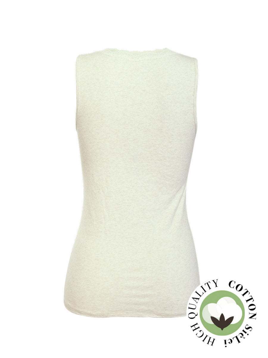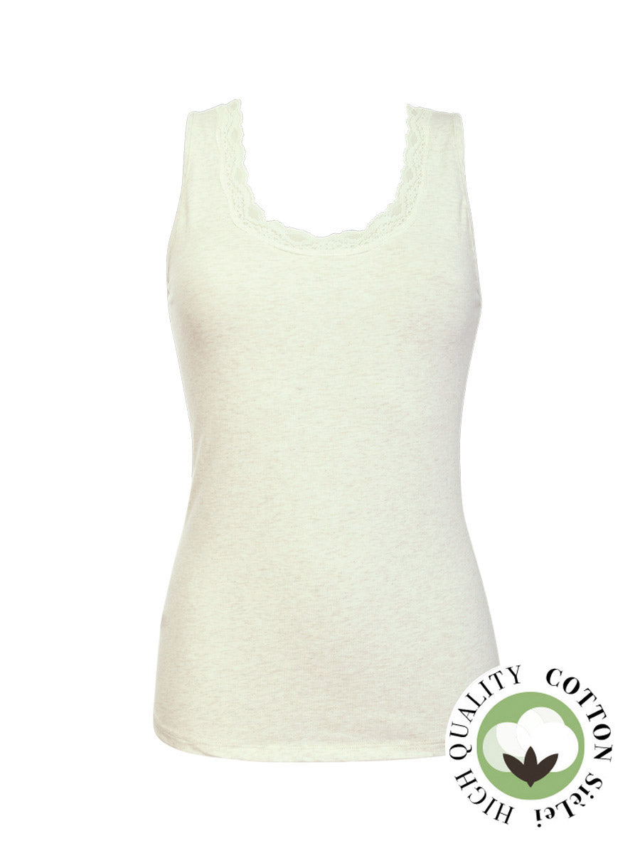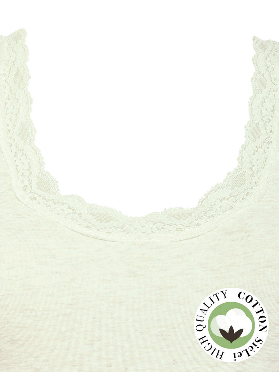 Canotta con spalla larga e scollo tondo bordato di pizzo, in cotone bio. Morbida, confortevole e disponibile in 5 colori