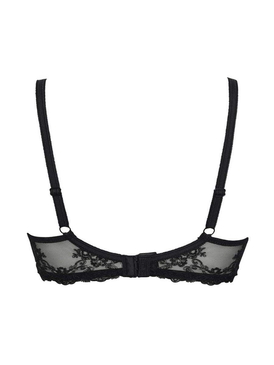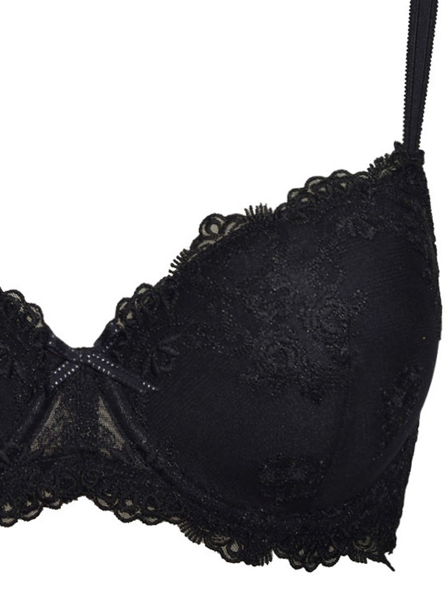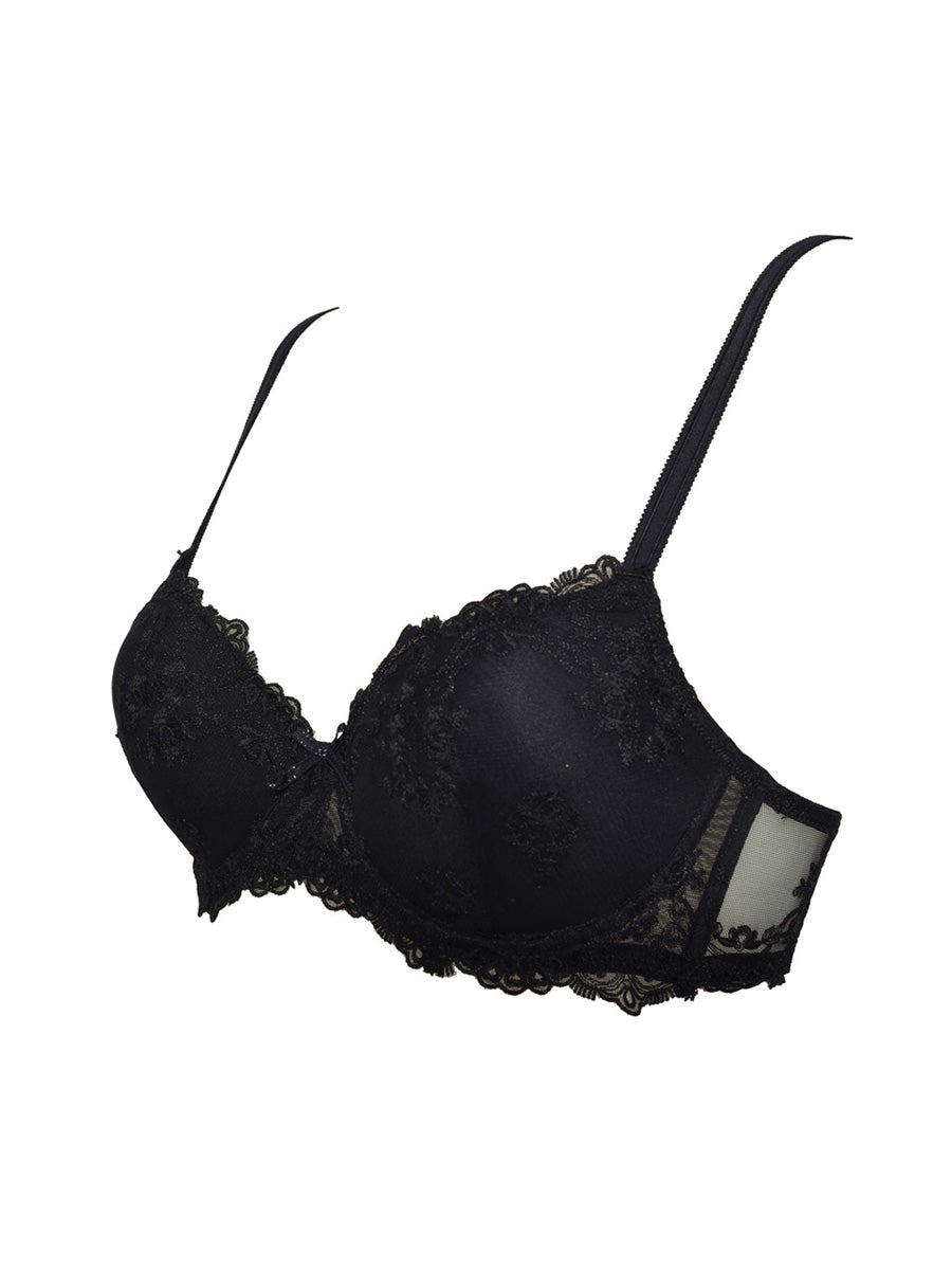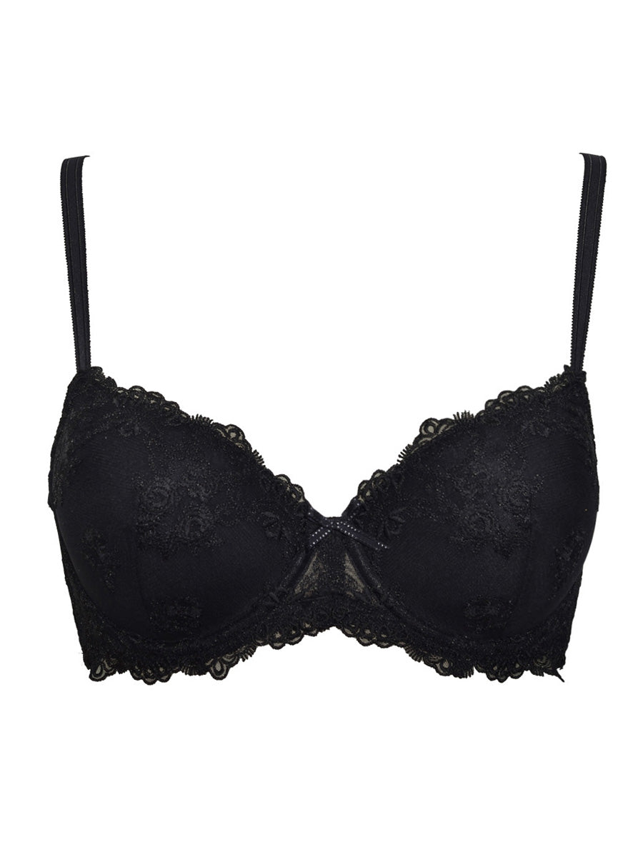 Reggiseno imbottito con ferretto realizzato in seducente tulle stretch dai ricami floreali. La struttura del reggiseno garantisce un ottimo sostegno anche per coppe differenziate C e D. Spesse spalline regoabili e delicato fiocchetto in centroseno ton sur ton.