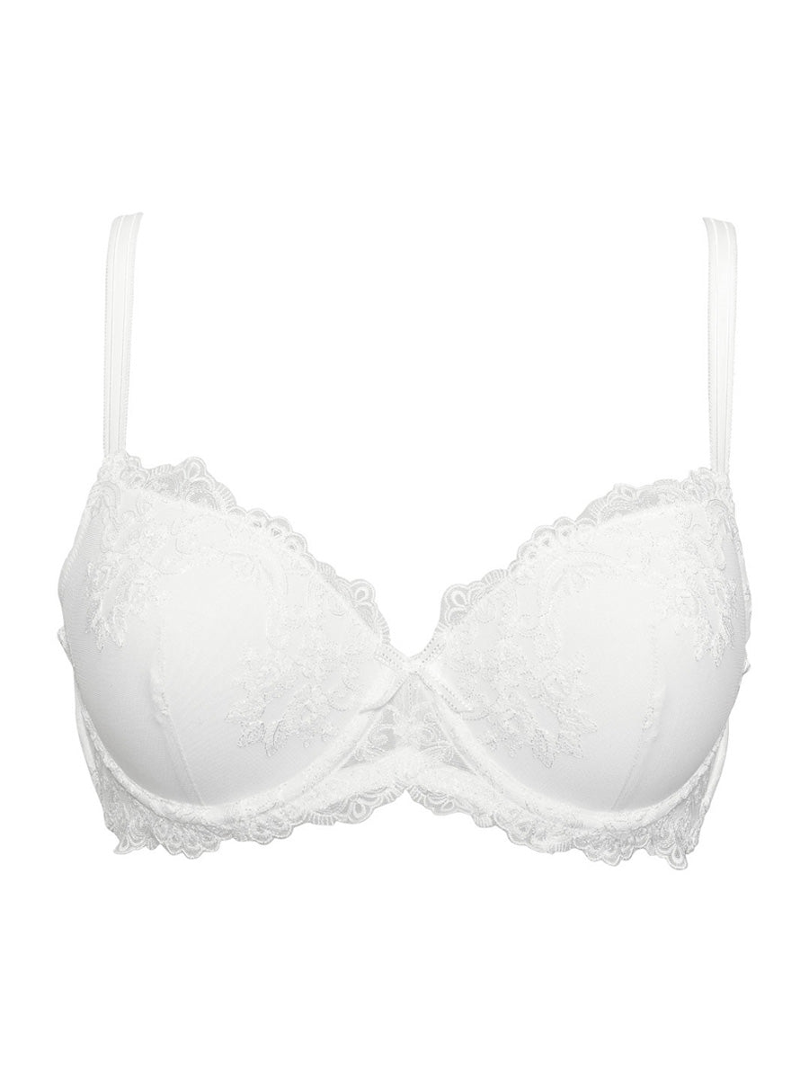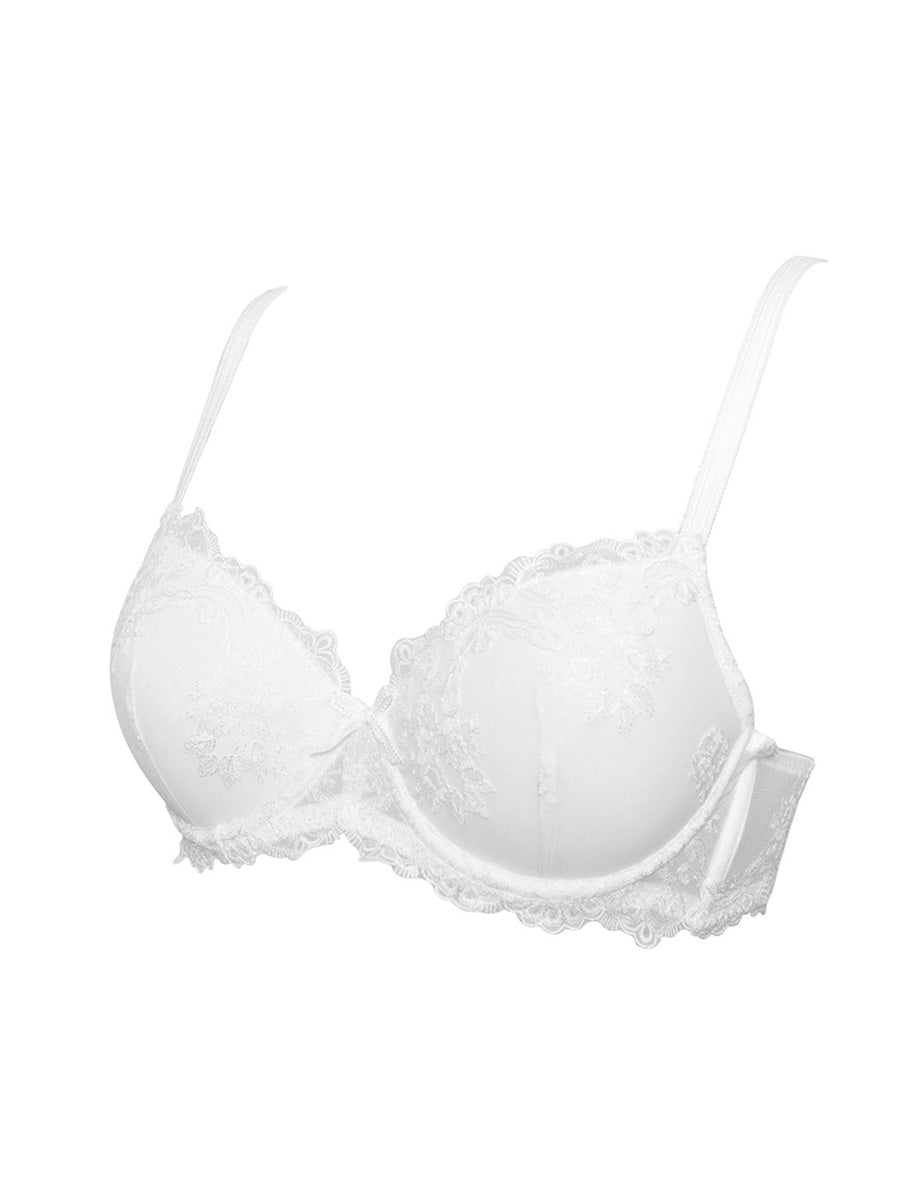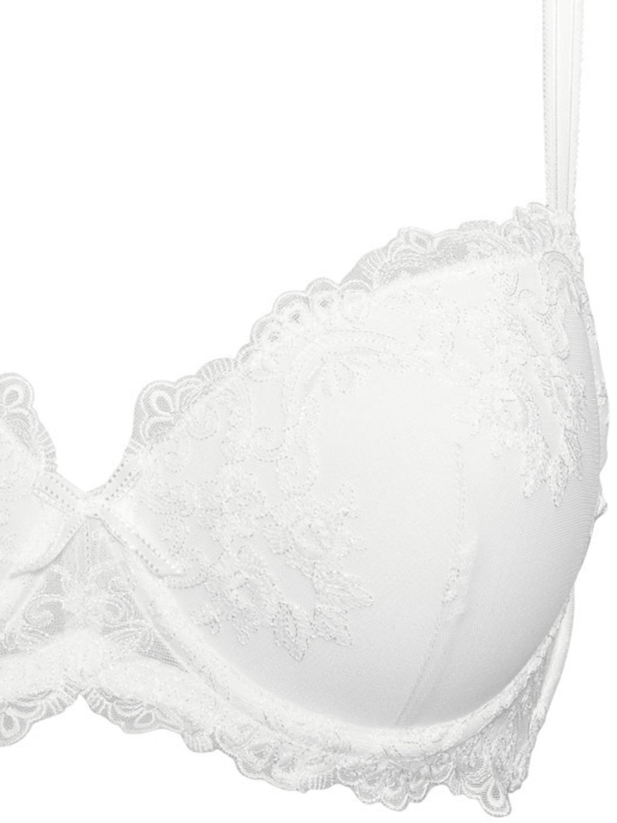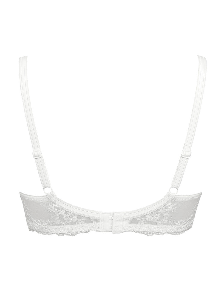 Reggiseno imbottito con ferretto realizzato in seducente tulle stretch dai ricami floreali. La struttura del reggiseno garantisce un ottimo sostegno anche per coppe differenziate C e D. Spesse spalline regoabili e delicato fiocchetto in centroseno ton sur ton.
