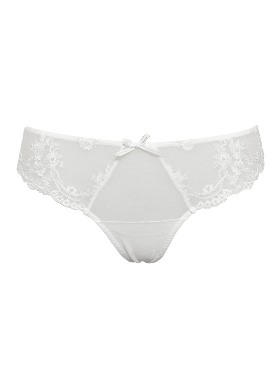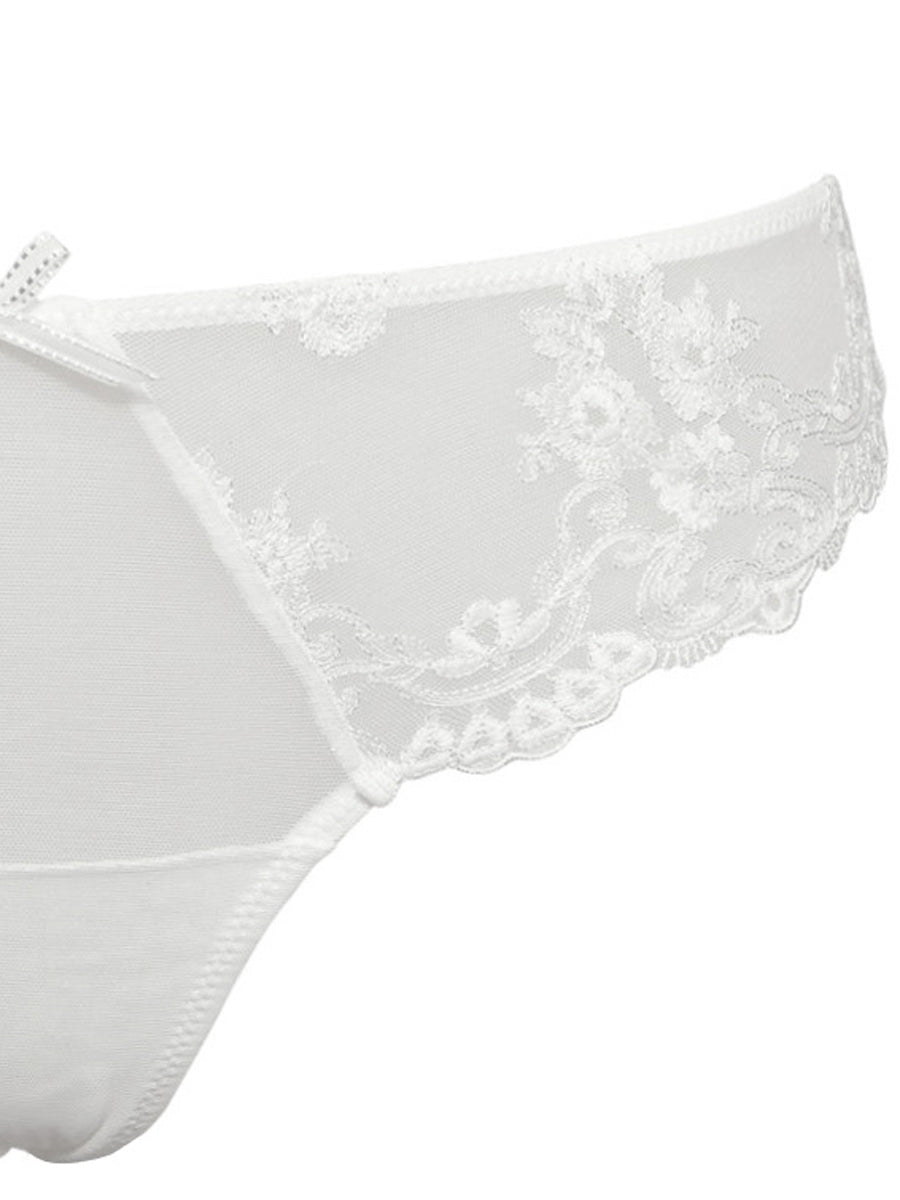 Un perizoma confortevole e dal gusto retrò grazie ai seducenti ricami floreali. Realizzato in morbido tulle e caratterizzato da un raffinato fiocchetto anteriore tono su tono. Tassello 100% cotone.