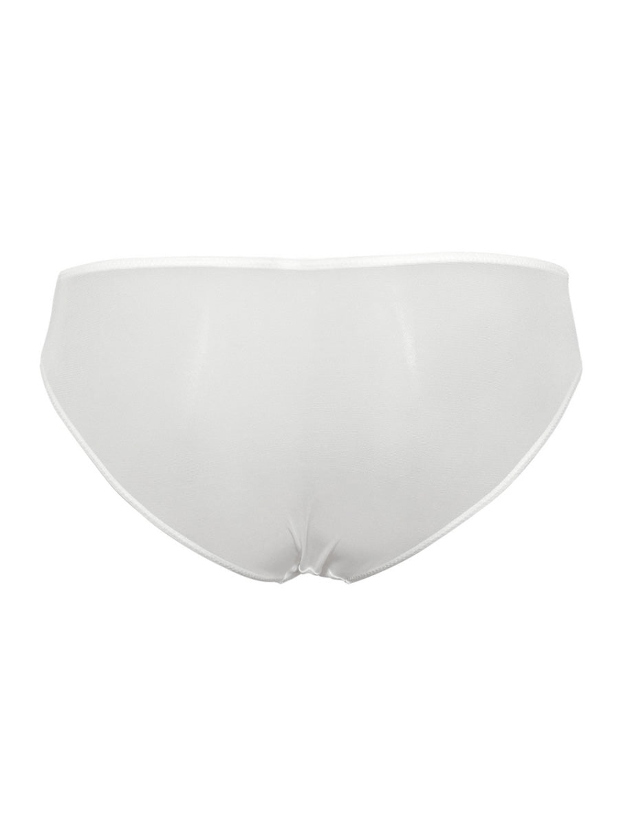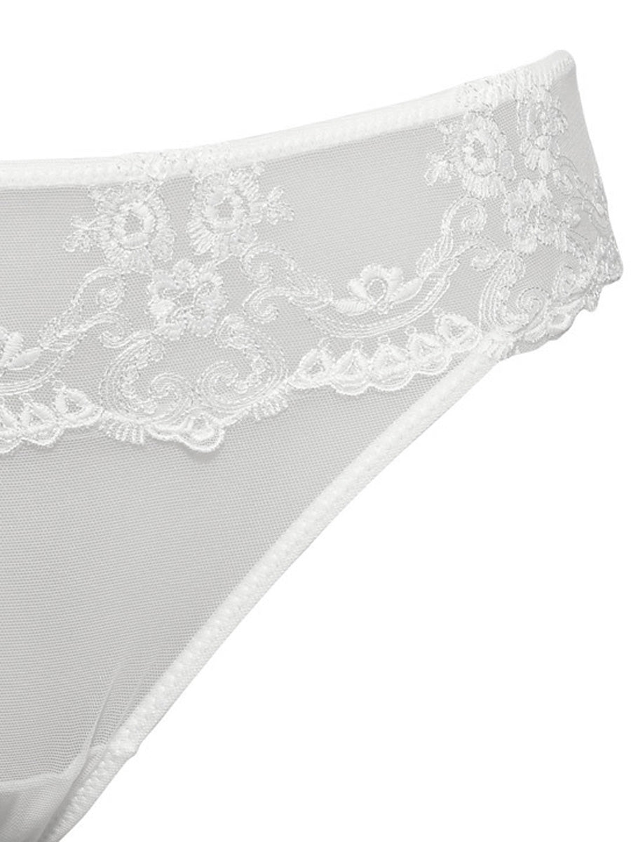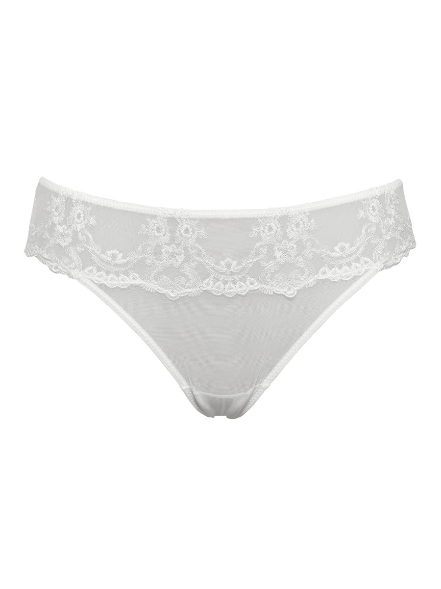 Lasciati conquistare dallo stile retrò senza tempo di questo modello. Slip realizzato in tulle ricamato con arabesque e motivi floreali. Un gioco di trasparenze irresistibile. Tassello 100% cotone.