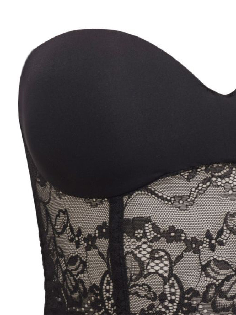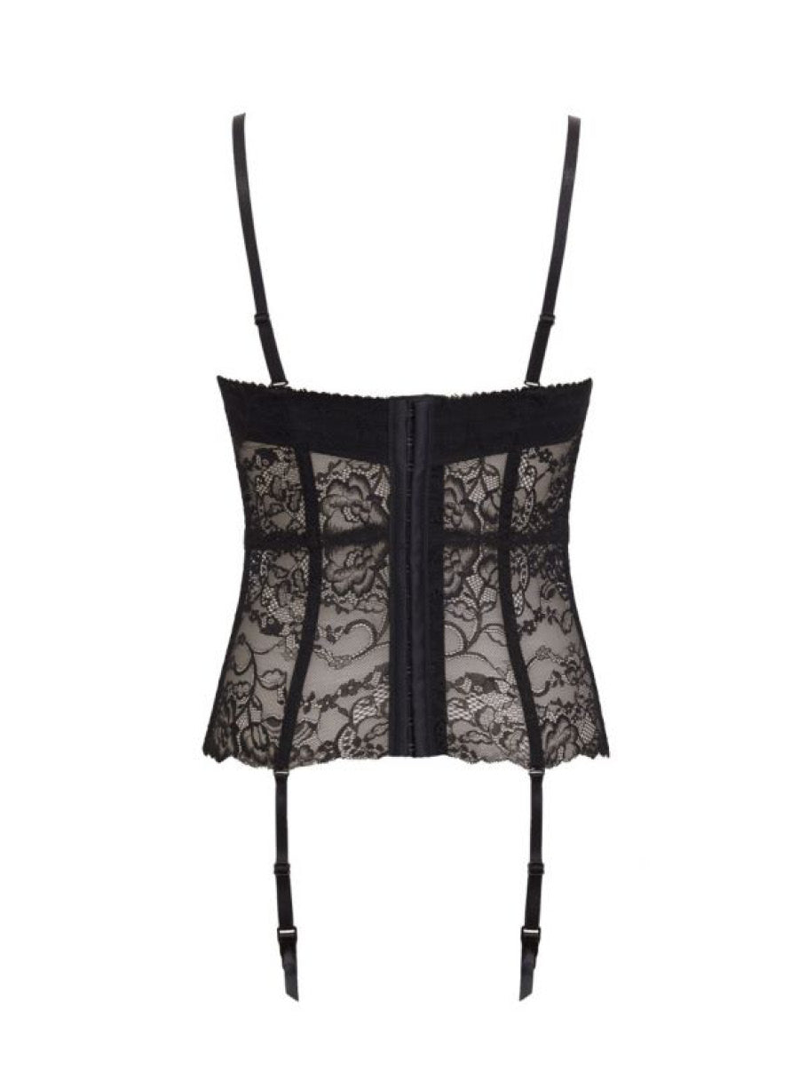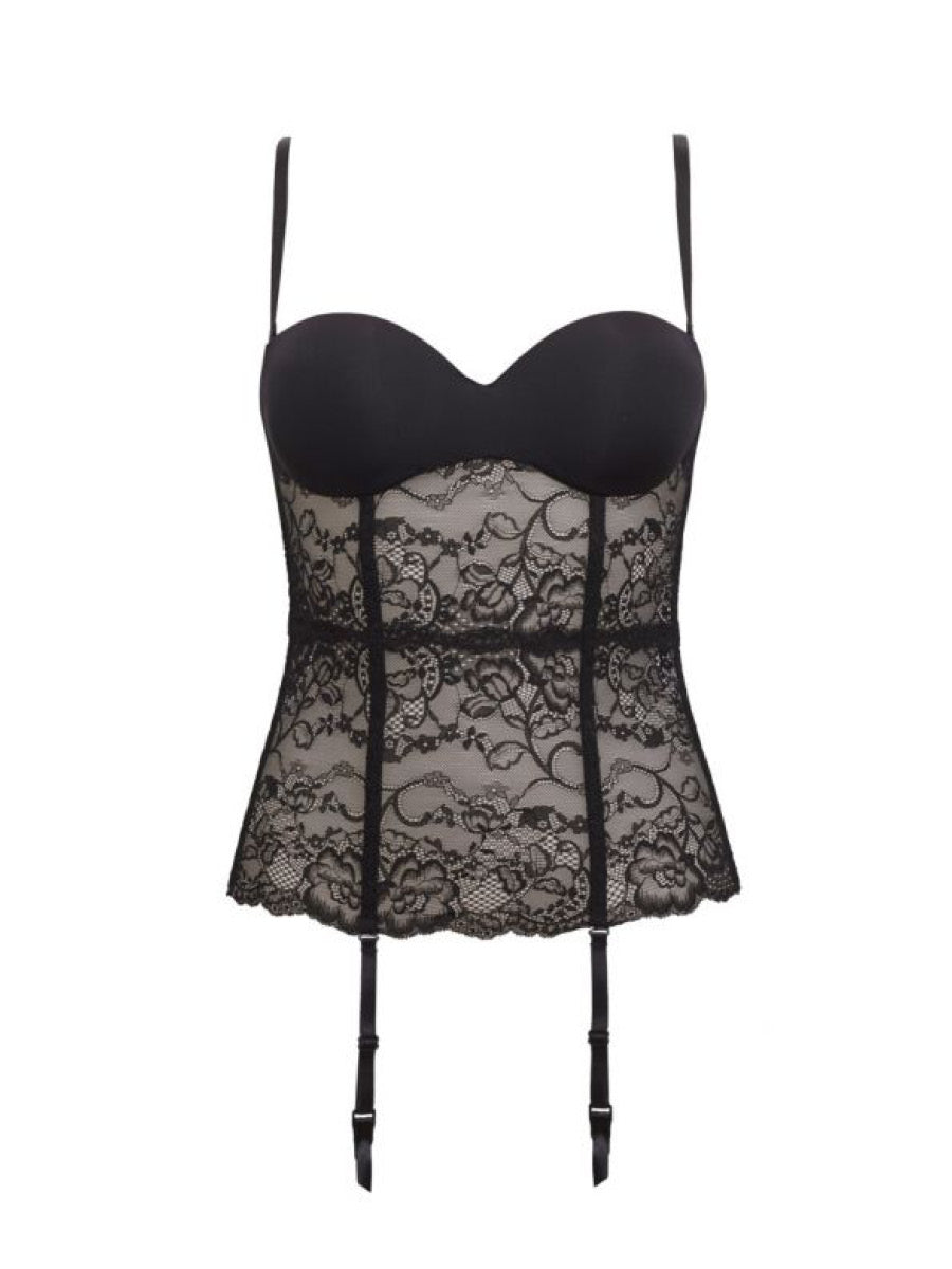 Guepiere con ferretto e coppe graduate realizzata in microfibra stretch semilucida abbinata ad un raffinato pizzo floreale. Velvet e spalline removibili