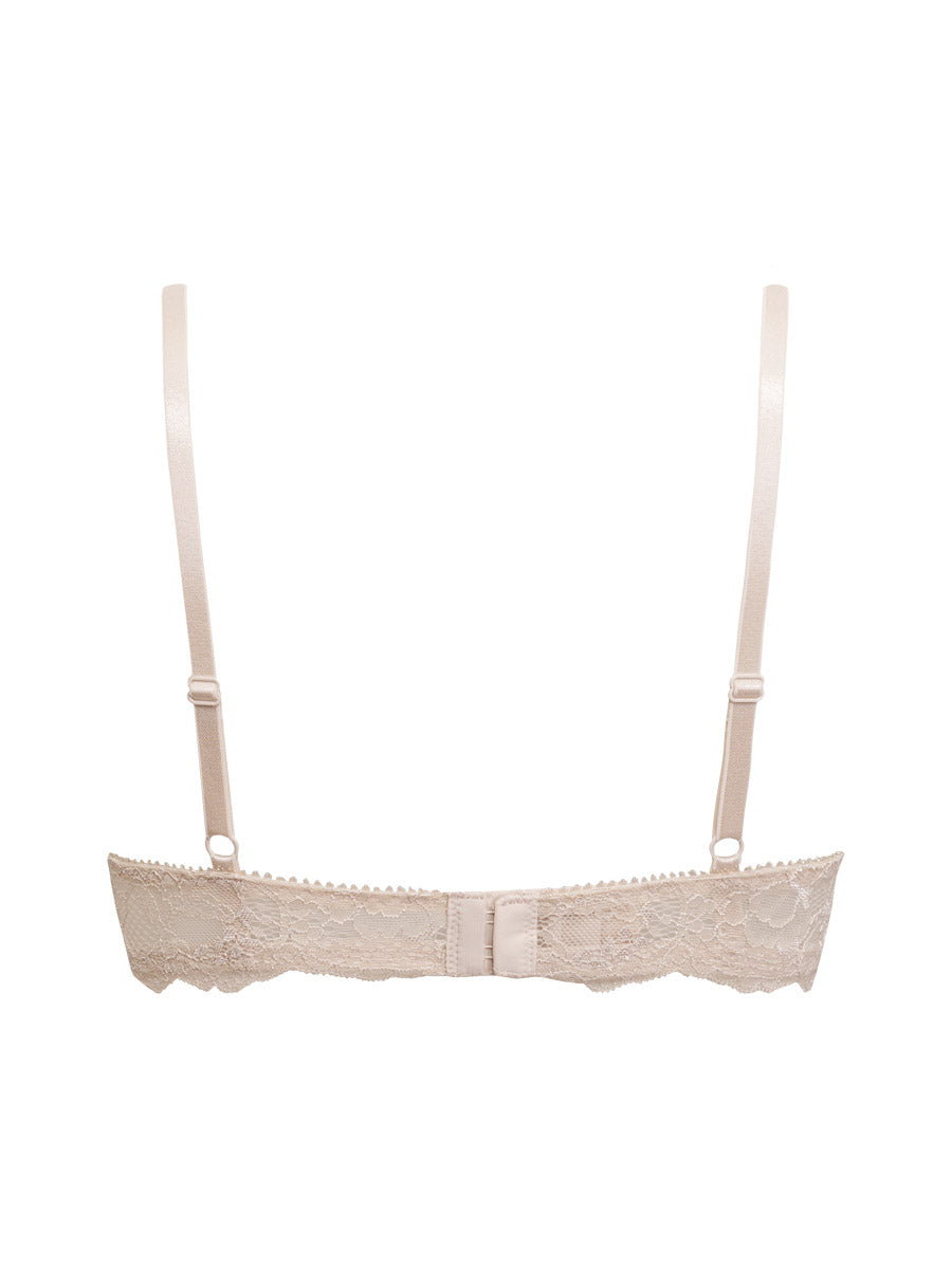 Reggiseno a fascia con ferretto e coppe graduate realizzato in microfibra stretch semilucida abbinata ad un raffinato pizzo floreale. Modello con spalline removibili e stecche laterali