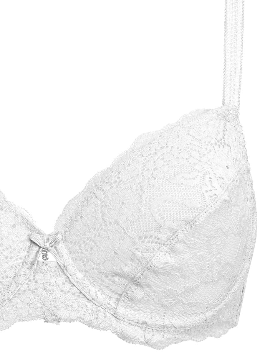 Un modello classico alla francese realizzato in morbido pizzo floreale. Le coppa con taglio orizzontale sono doppiate internamente in tulle e assicurano un'ottima vestibilità. Il torace è in laize di pizzo con spalline regolabili. Dettaglio a centroseno di fiocchetto in raso con gioiello e punto luce.