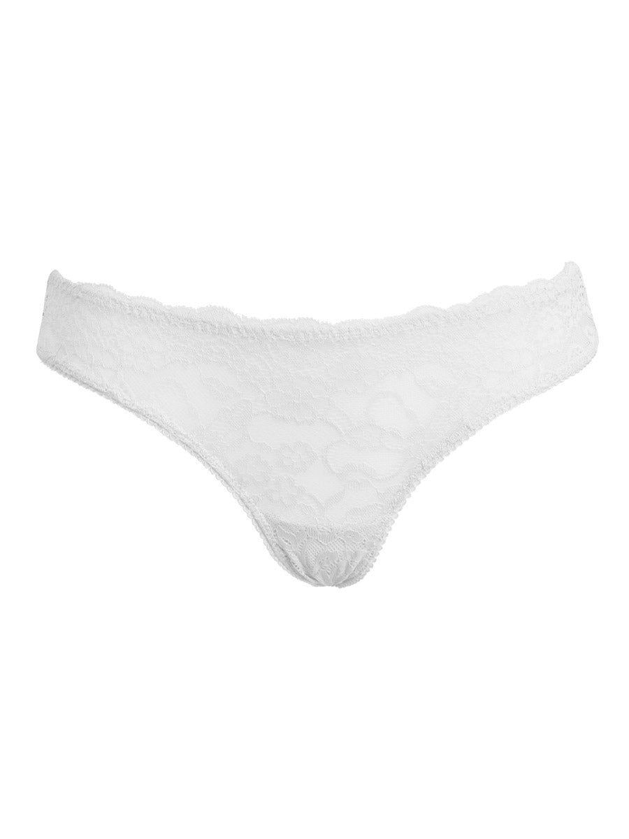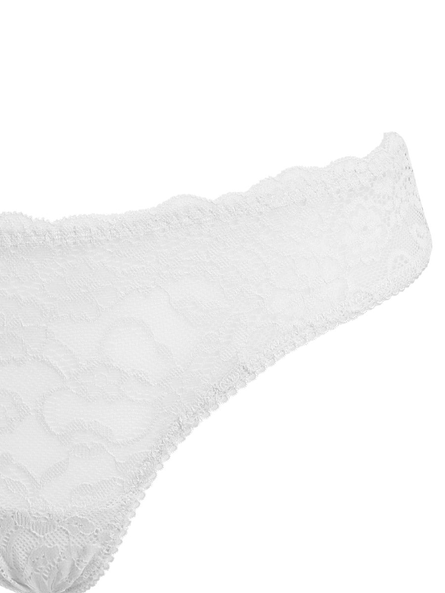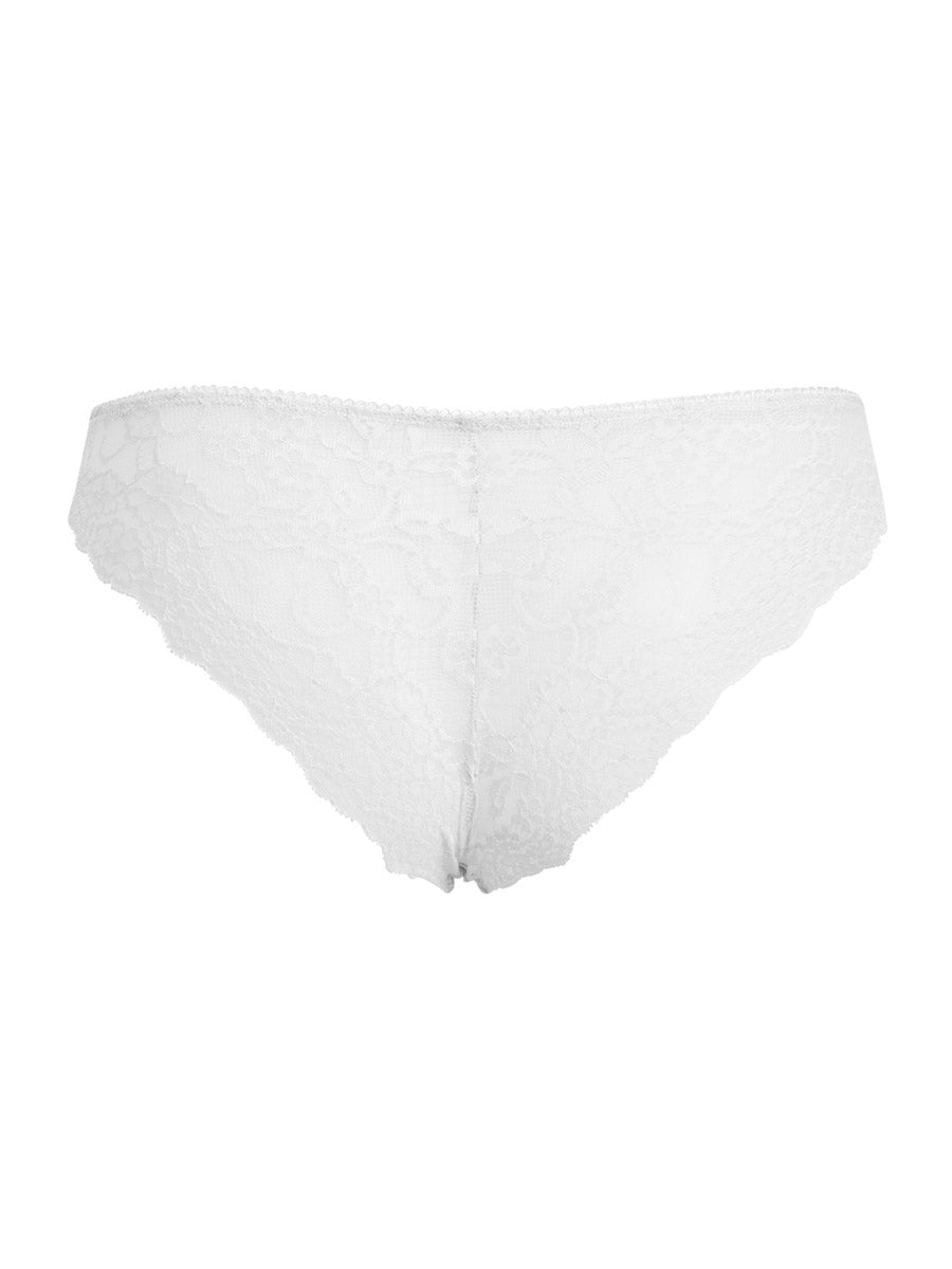 Slip realizzato in raffinata balza di pizzo stretch con cordonetto in rilievo a motivo floreale. Tassello 100% cotone.