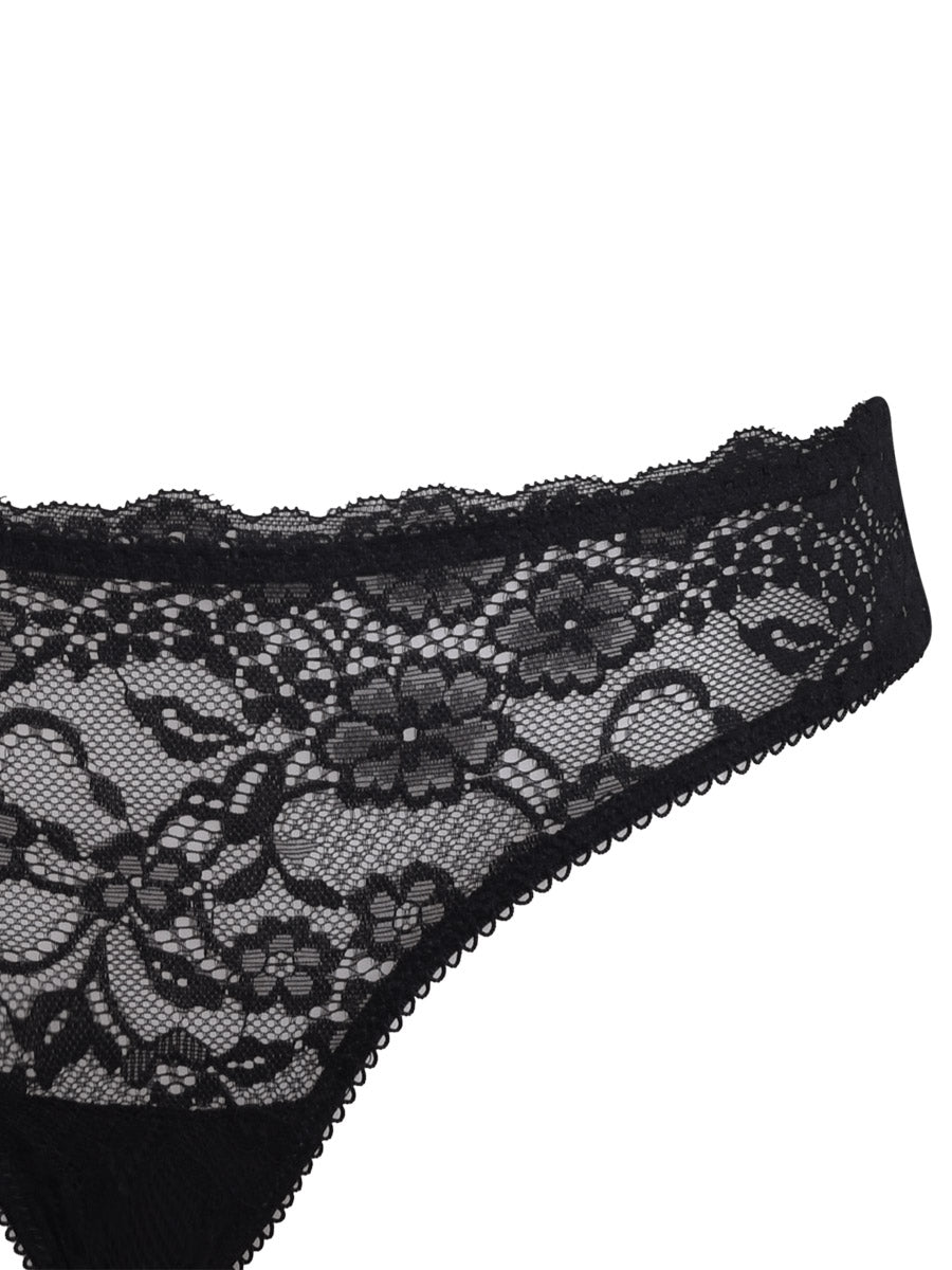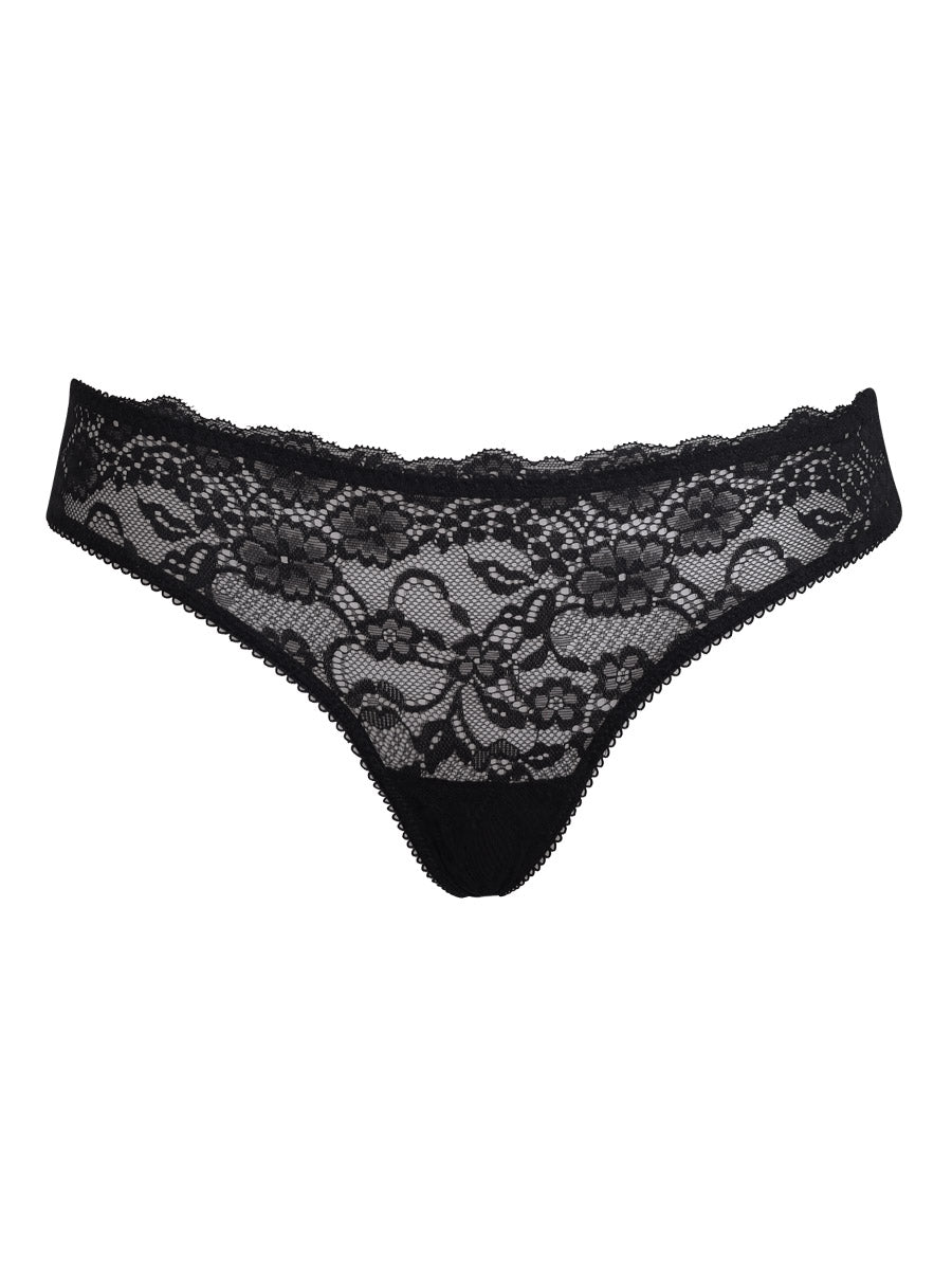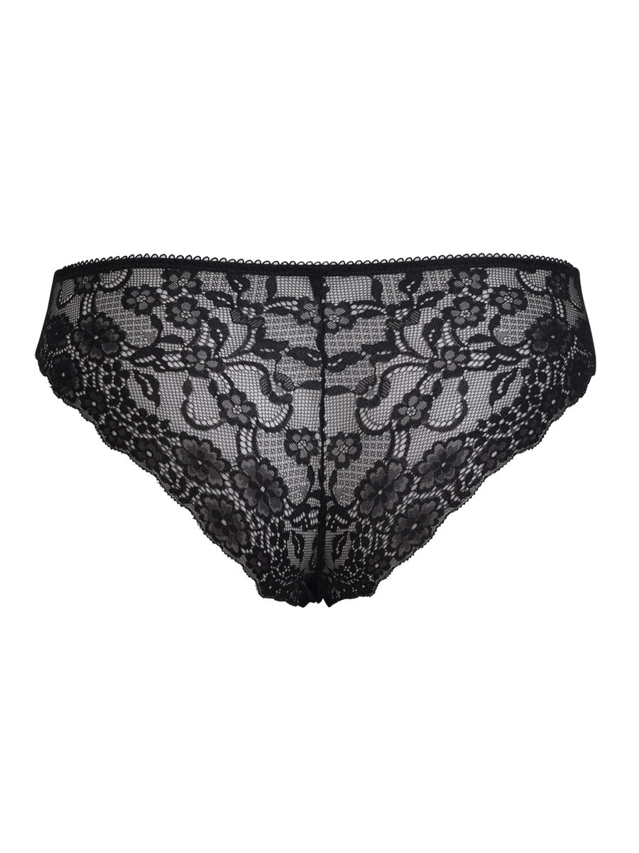 Slip realizzato in raffinata balza di pizzo stretch con cordonetto in rilievo a motivo floreale. Tassello 100% cotone.