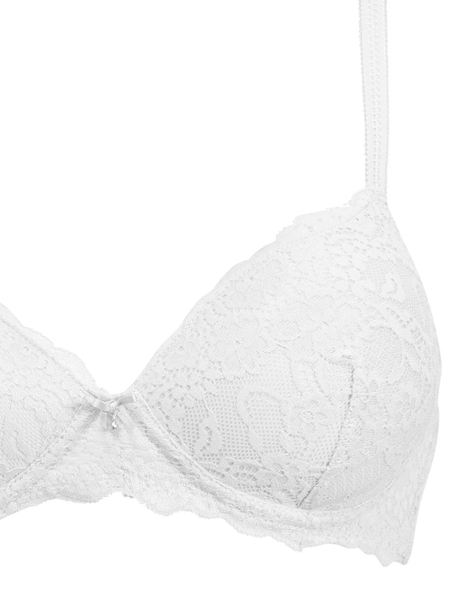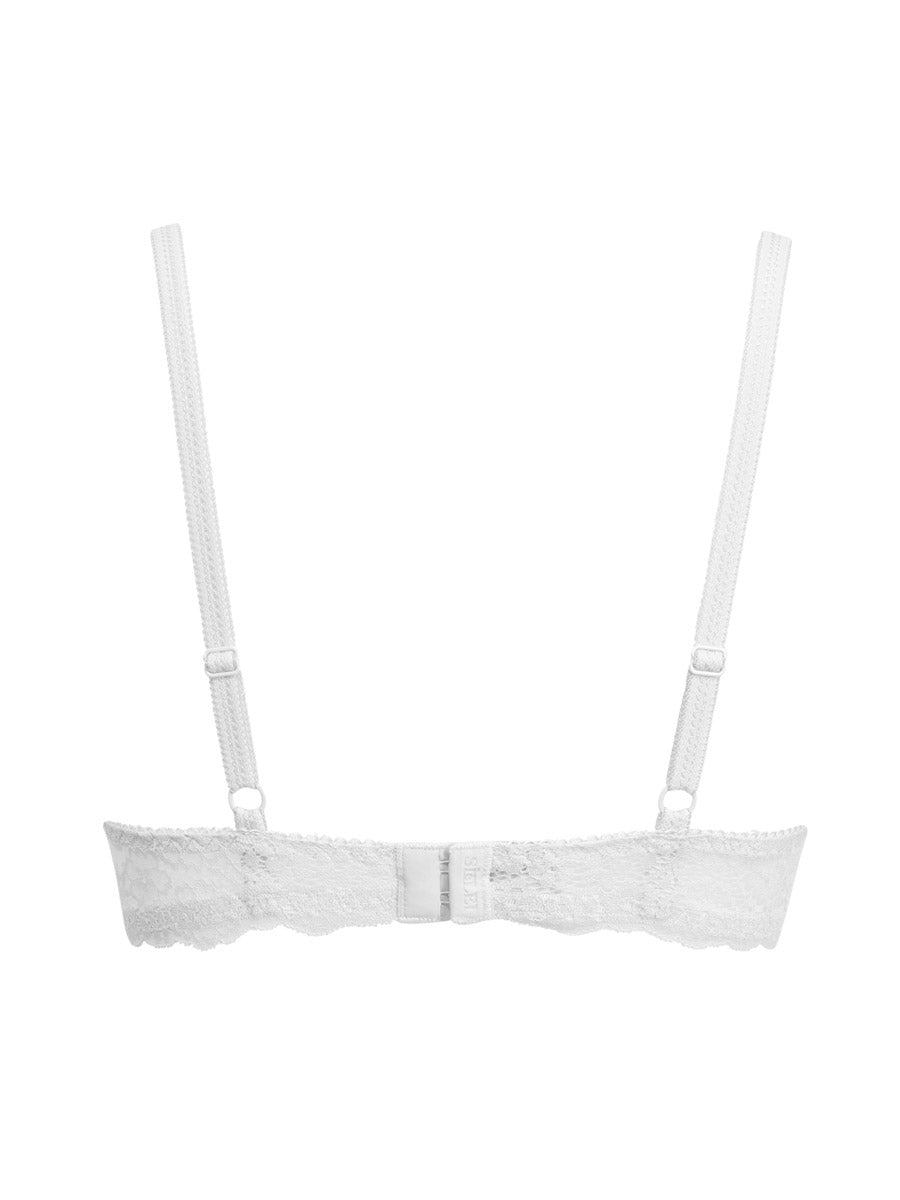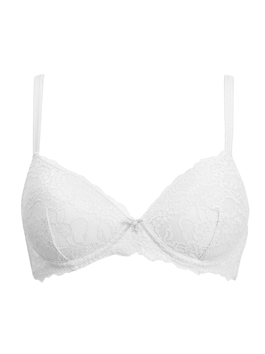 Reggiseno con coppe graduate e senza ferretto, realizzato in raffinata balza di pizzo con motivo floreale. Torace e centroseno in laize di pizzo con spalline regolabili. Dettaglio a centroseno di fiocchetto in raso con gioiello e punto luce