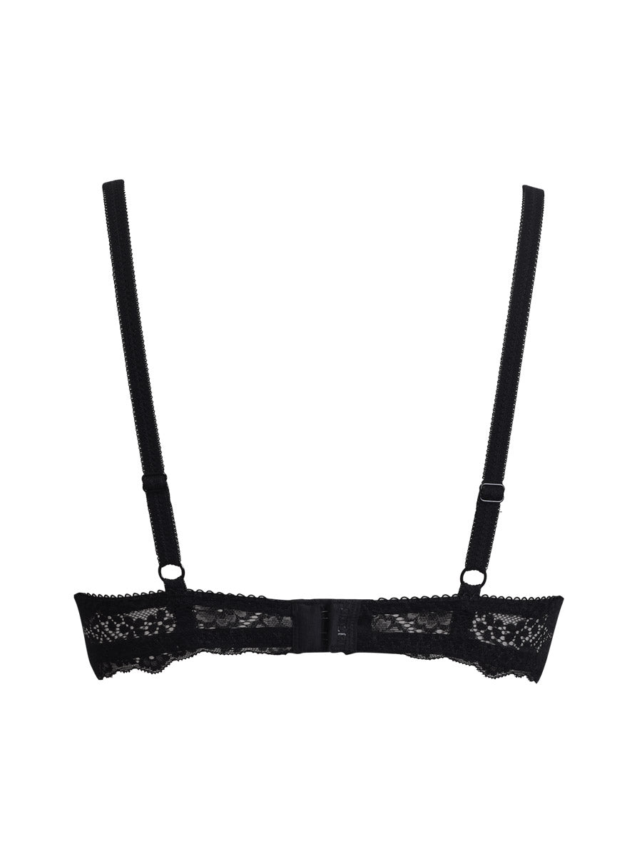 Reggiseno con coppe graduate e senza ferretto, realizzato in raffinata balza di pizzo con motivo floreale. Torace e centroseno in laize di pizzo con spalline regolabili. Dettaglio a centroseno di fiocchetto in raso con gioiello e punto luce