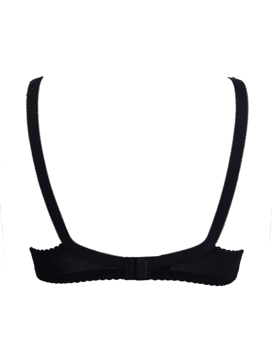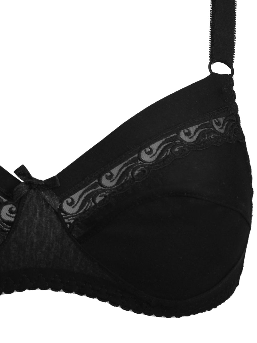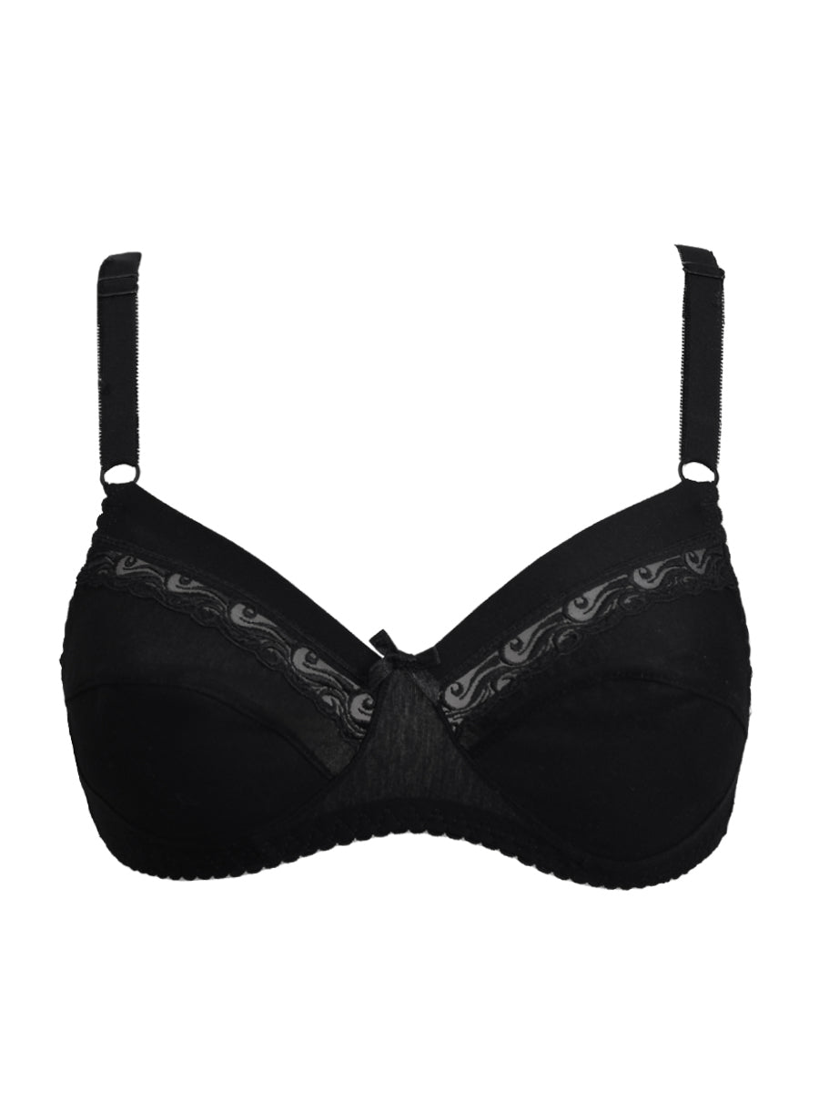 Reggiseno classico in puro cotone, senza imbottitura e senza ferretto, con coppe disegnate da morbide cuciture e incorniciate da un pizzo leggero e fiocchetto nel centroseno. Molto confortevole.