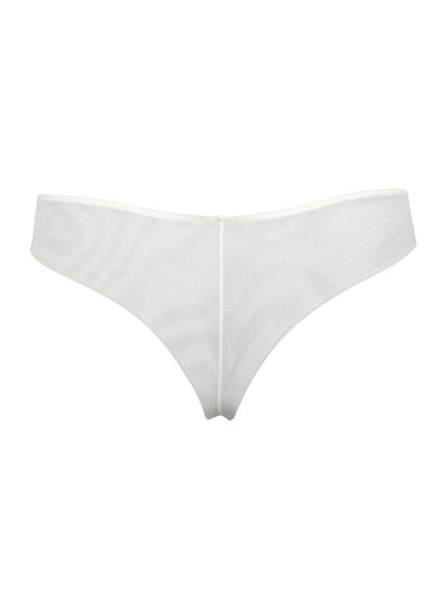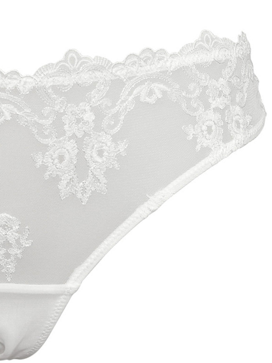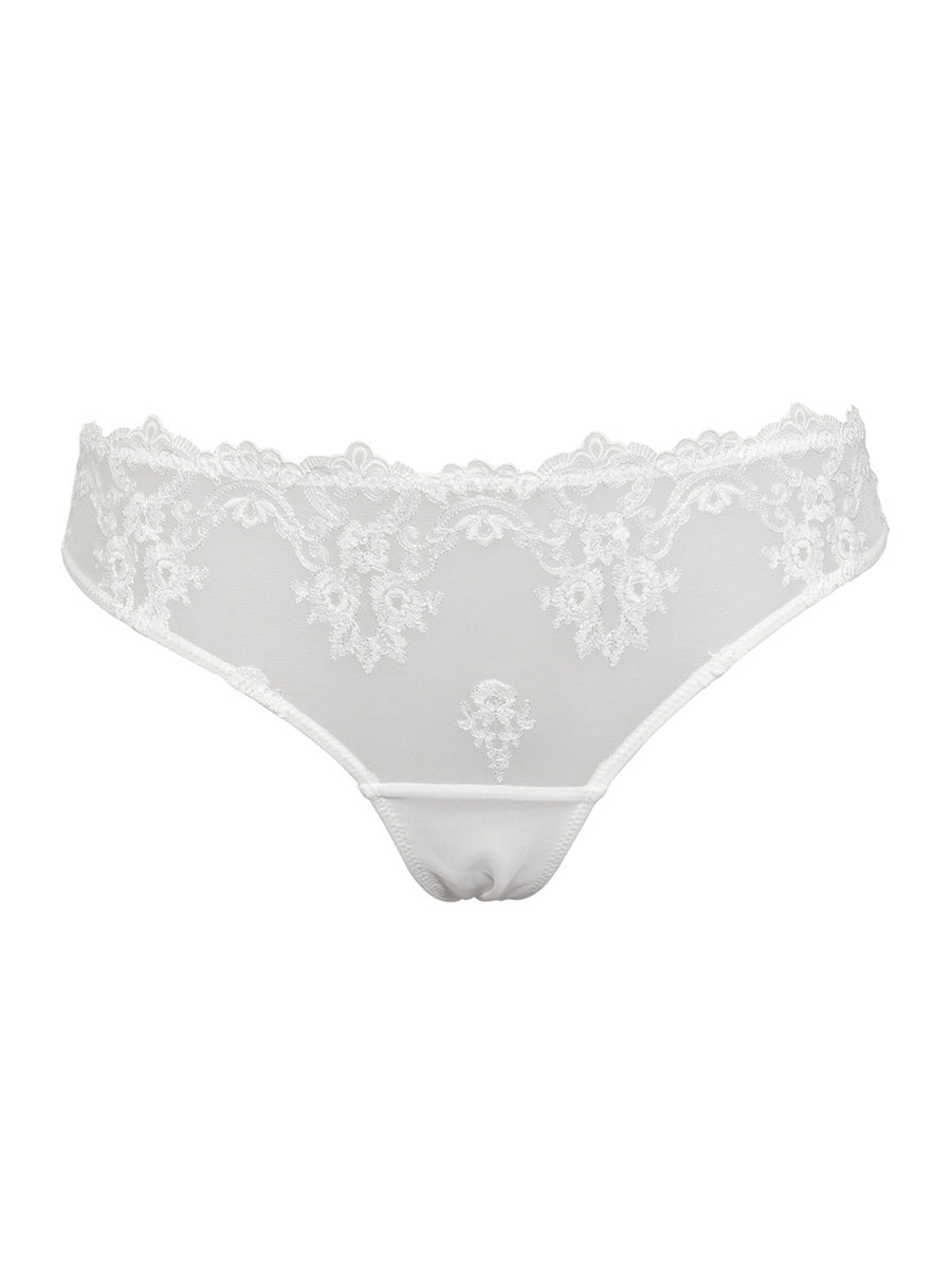 Seducente brasiliana realizzata in raffinato tulle stretch ricamato. Modello con cucitura centrale sul retro che assicura ottima vestibilità. Tassello 100% cotone.