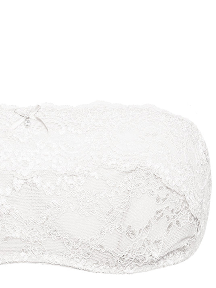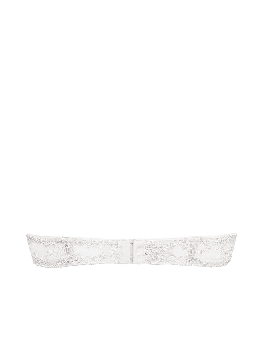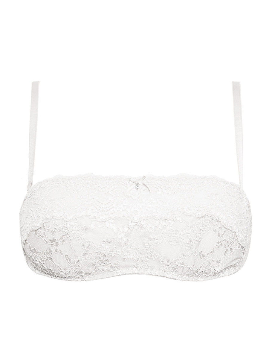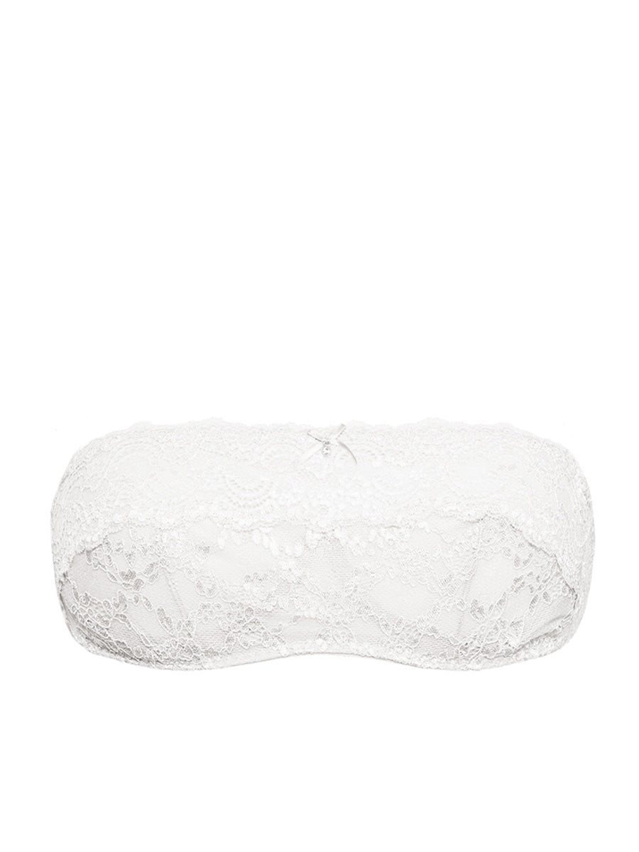 Reggiseno a fascia non imbottito con ferretto invisibile e spalline regolabili e removibili. Realizzato in raffinato e morbido laize di pizzo stretch con cordonetto in rilievo a motivo floreale, impreziosito da un galloncino sempre in pizzo. Interno coppe doppiato in tulle per assicurare massima vestibilità. Dettaglio a centroseno di fiocchetto in raso con gioiello e punto luce.