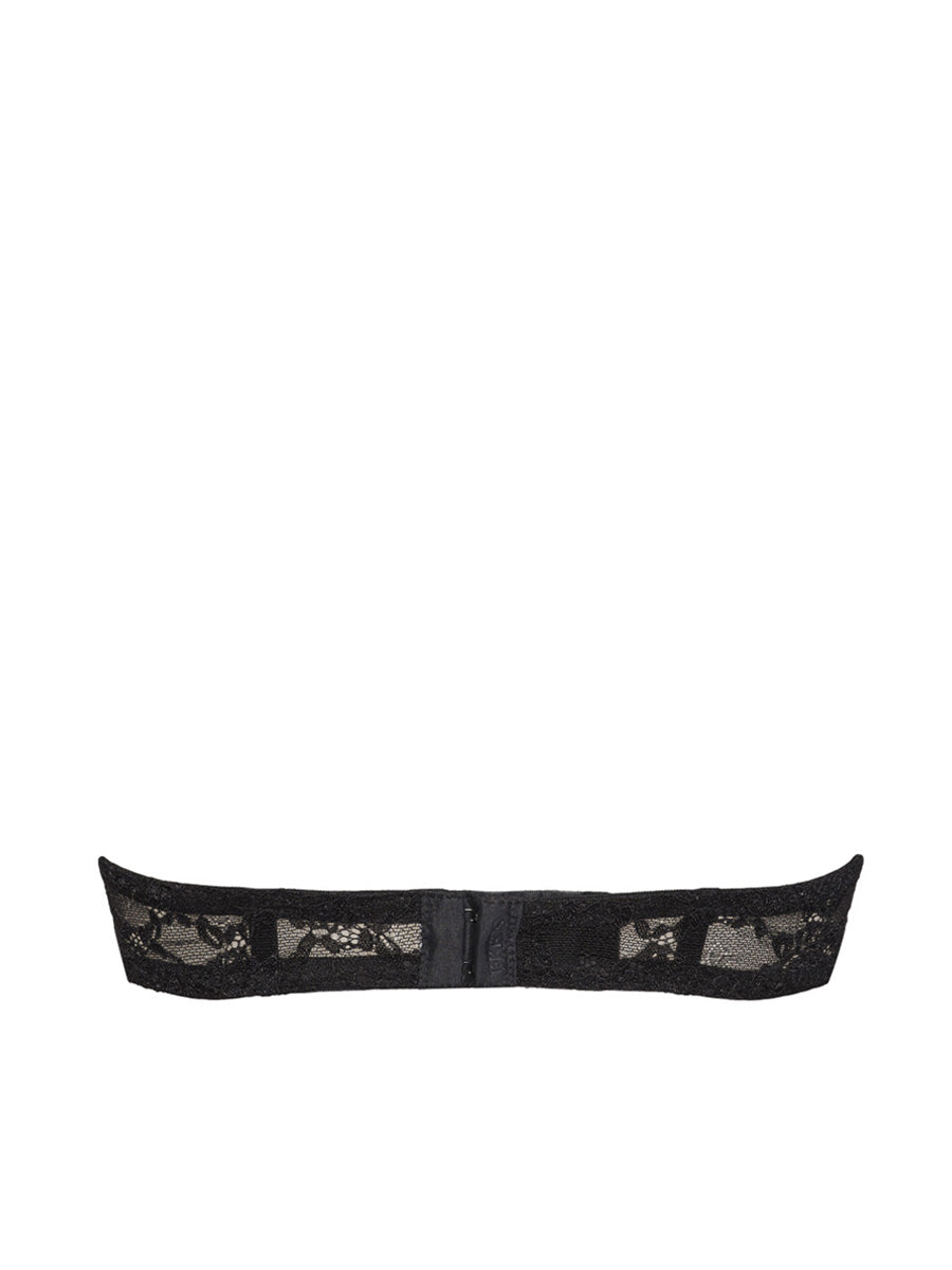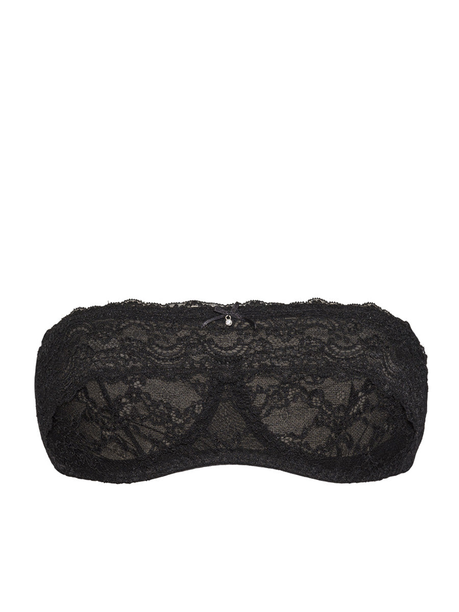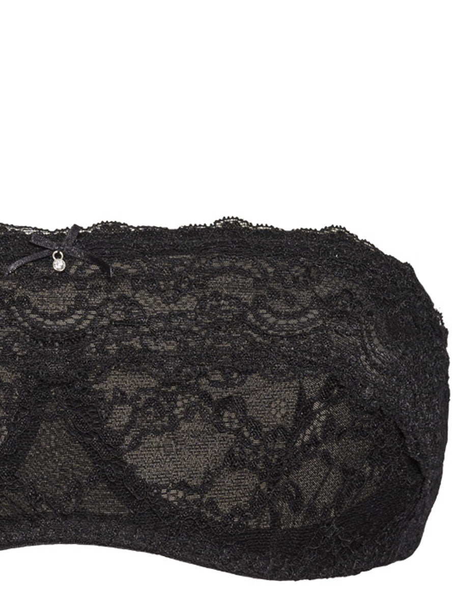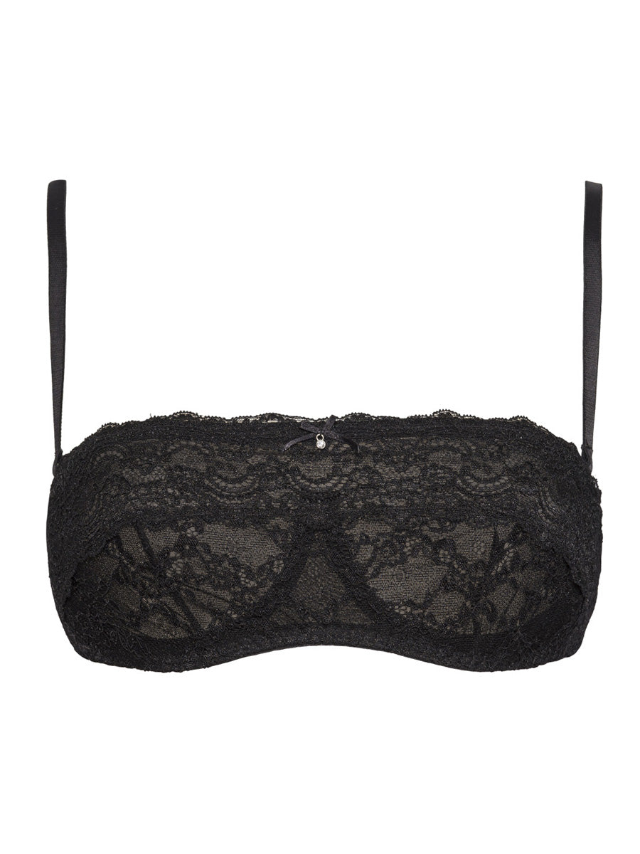 Reggiseno a fascia non imbottito con ferretto invisibile e spalline regolabili e removibili. Realizzato in raffinato e morbido laize di pizzo stretch con cordonetto in rilievo a motivo floreale, impreziosito da un galloncino sempre in pizzo. Interno coppe doppiato in tulle per assicurare massima vestibilità. Dettaglio a centroseno di fiocchetto in raso con gioiello e punto luce.