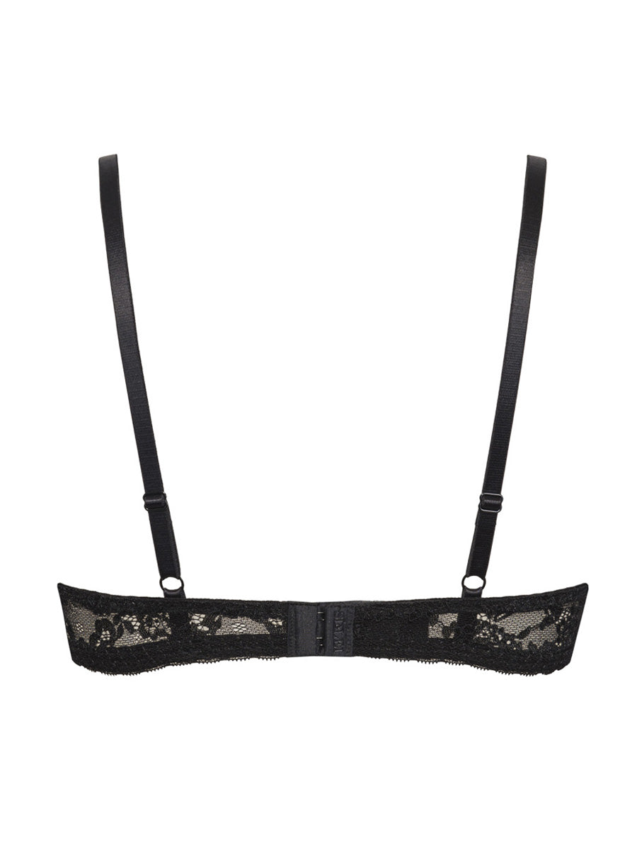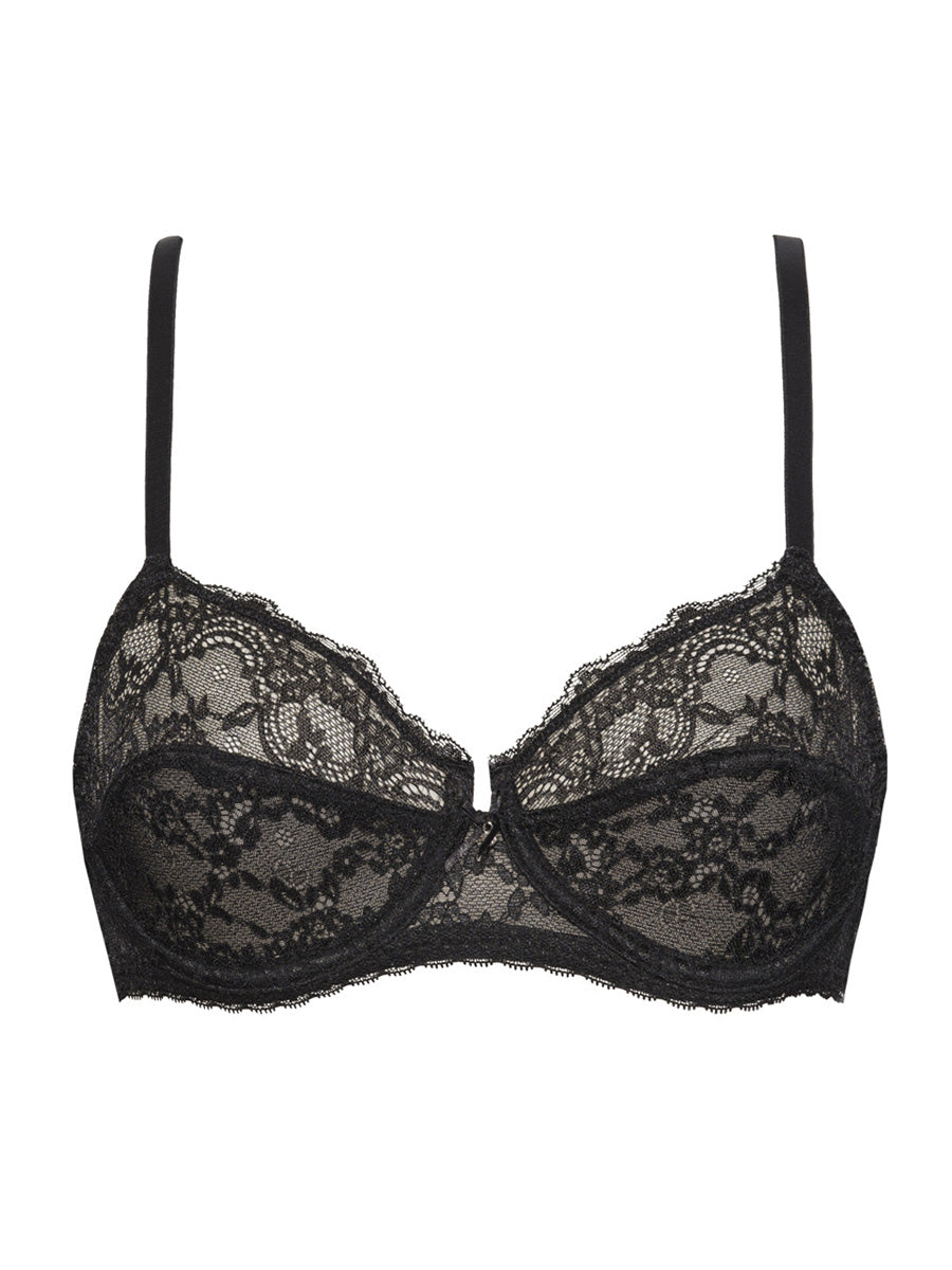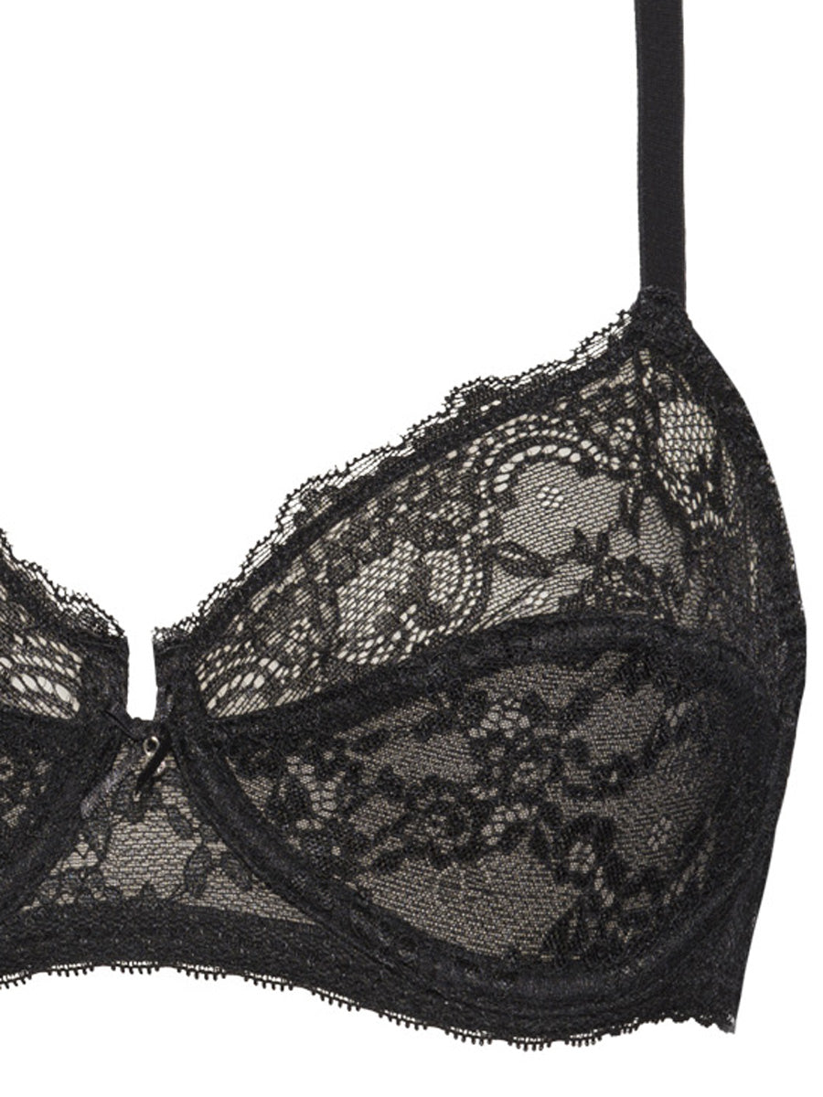 Un modello classico alla francese realizzato in morbido laize di pizzo stretch con cordonetto in rilievo a ricamo floreale con un effetto "lucido". Le coppa con taglio orizzontale sono doppiate internamente in tulle e assicurano un'ottima vestibilità. Il torace è in laize di pizzo con spalline regolabili. Dettaglio a centroseno di fiocchetto in raso con gioiello e punto luce.