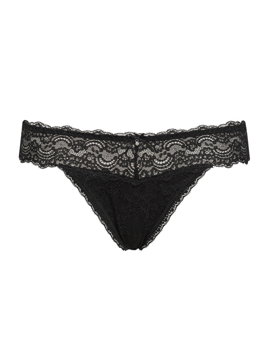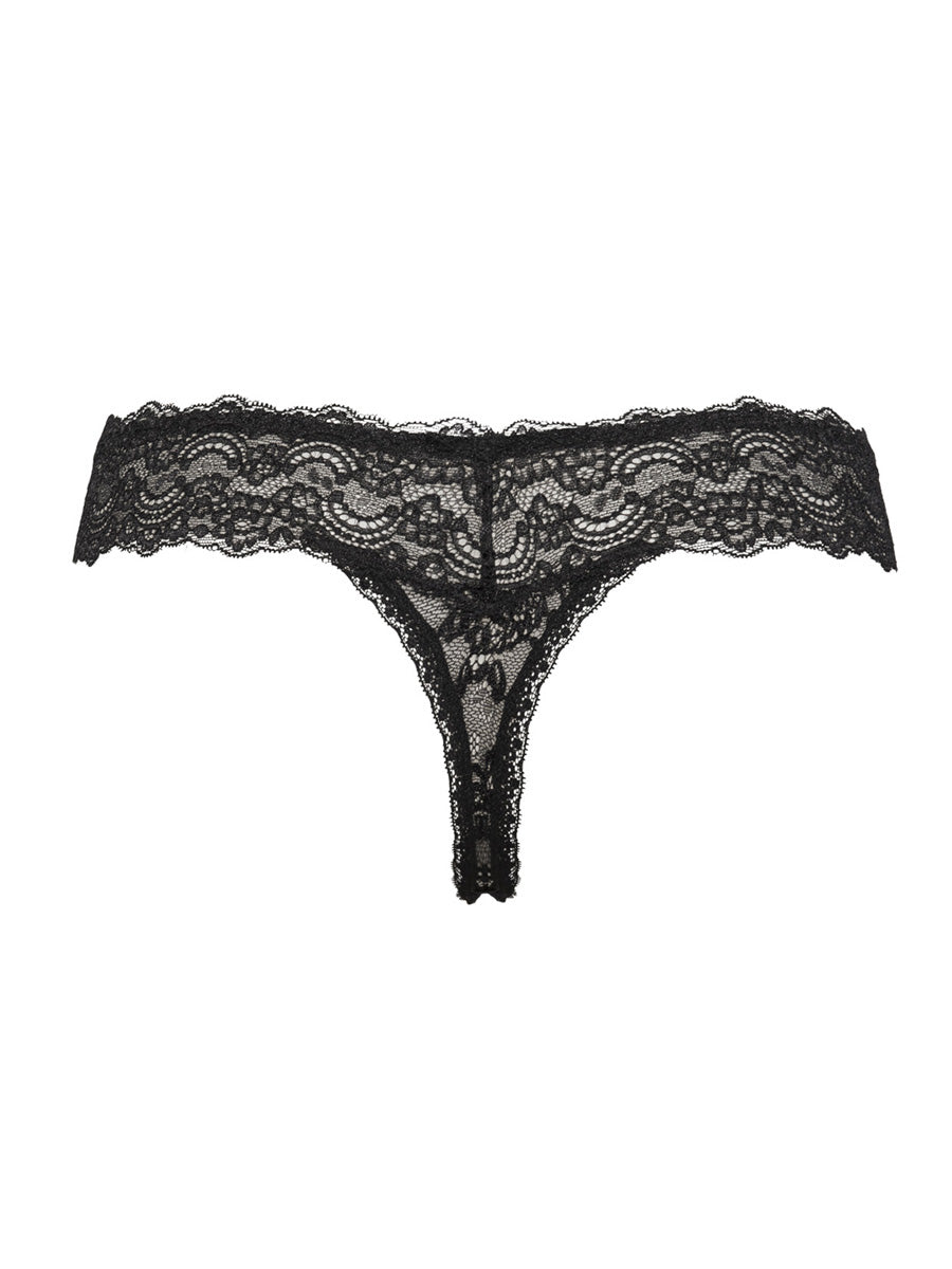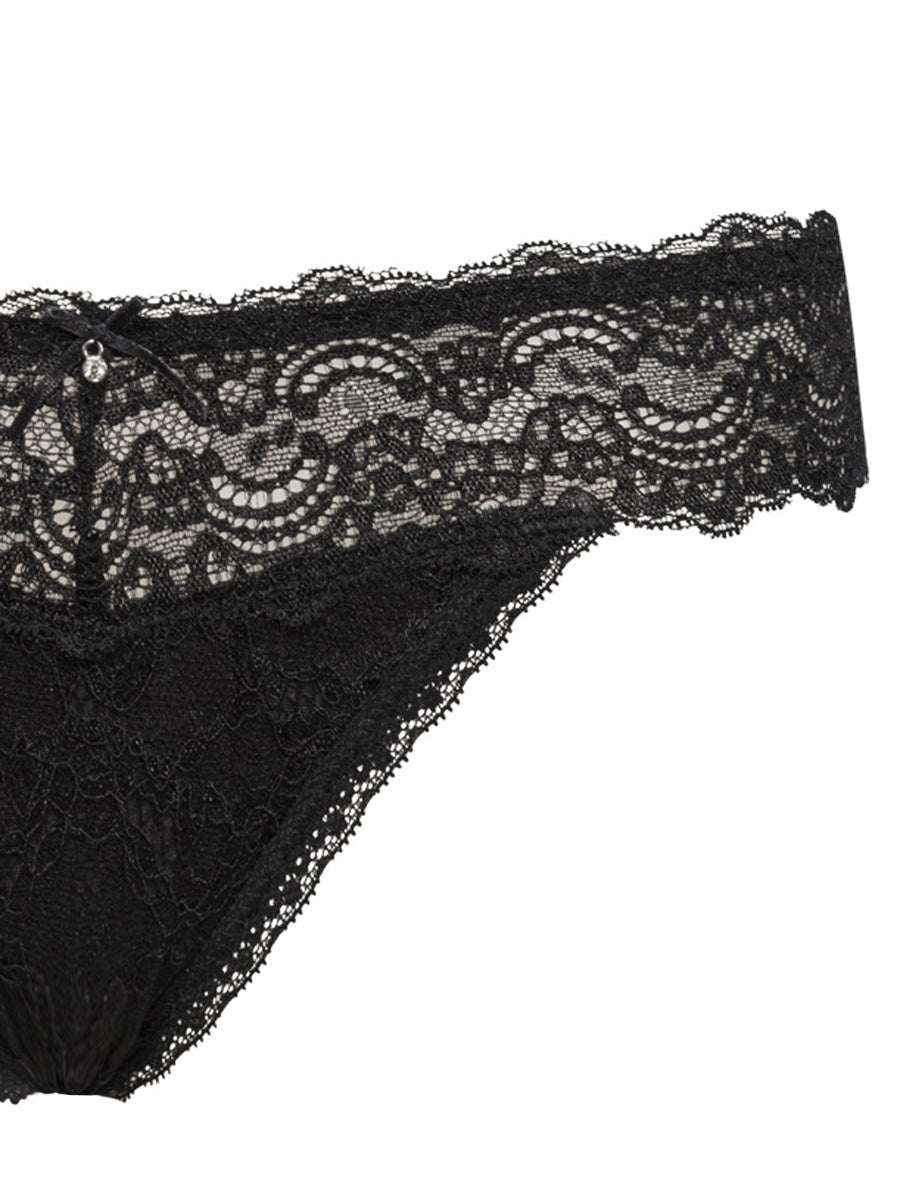 Perizoma realizzato in raffinata balza di pizzo stretch con cordonetto in rilievo a motivo floreale e impreziosito da un galloncino sempre in pizzo. Dettaglio di fiocchetto in raso con gioiello e punto luce.
