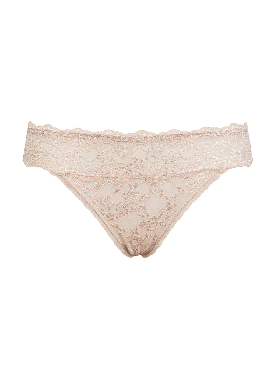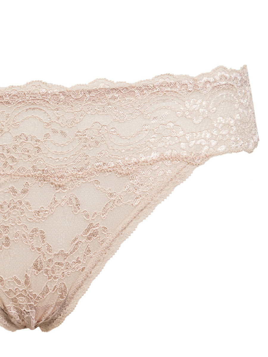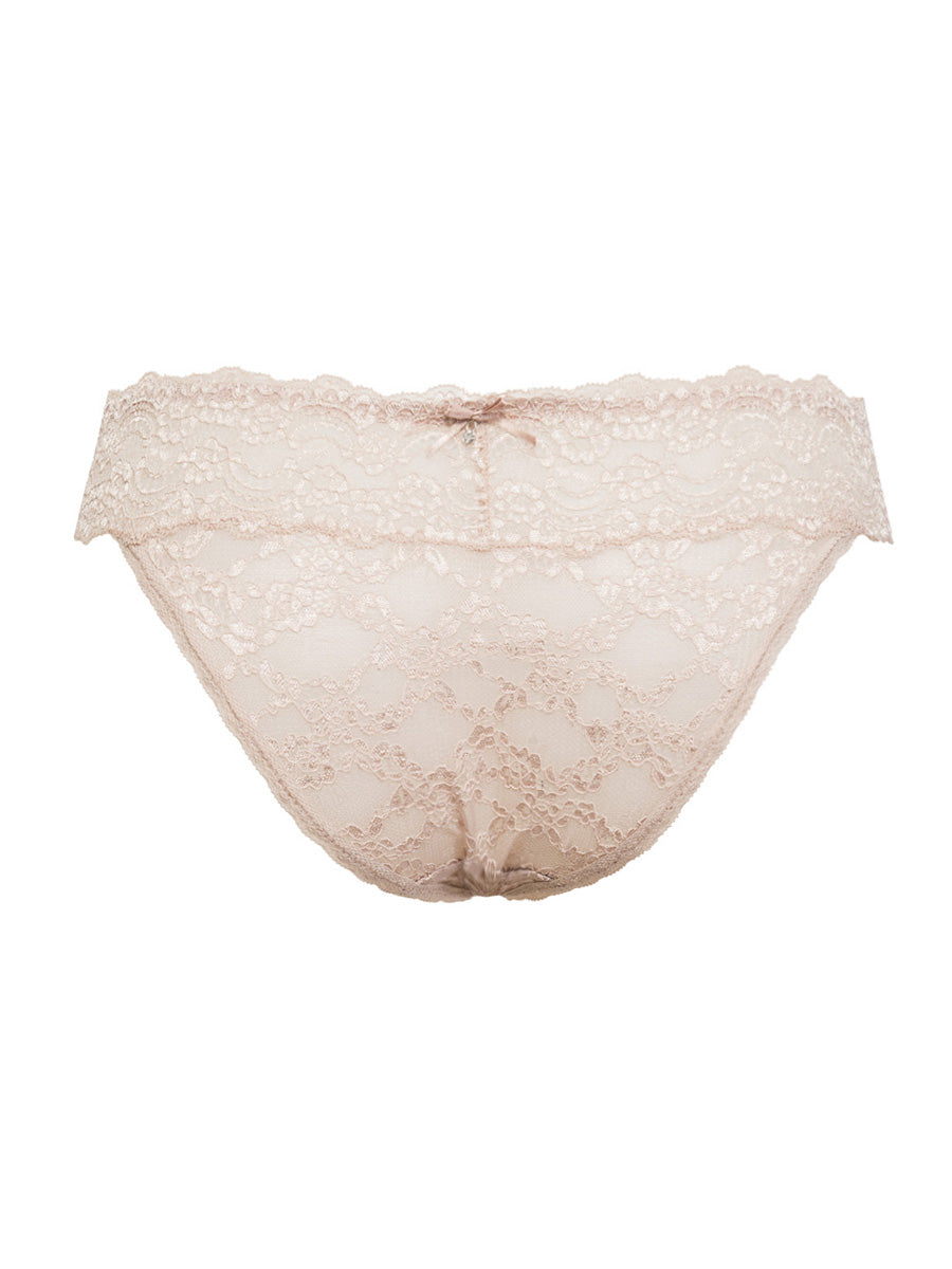 Slip realizzato in raffinata balza di pizzo stretch con cordonetto in rilievo a motivo floreale e impreziosito da un galloncino sempre in pizzo. Dettaglio di fiocchetto in raso con gioiello e punto luce.
