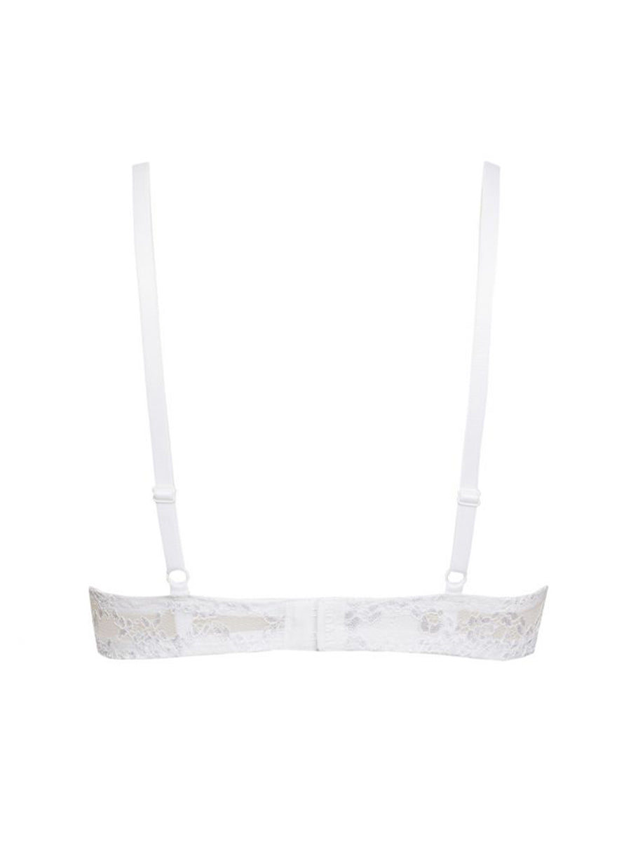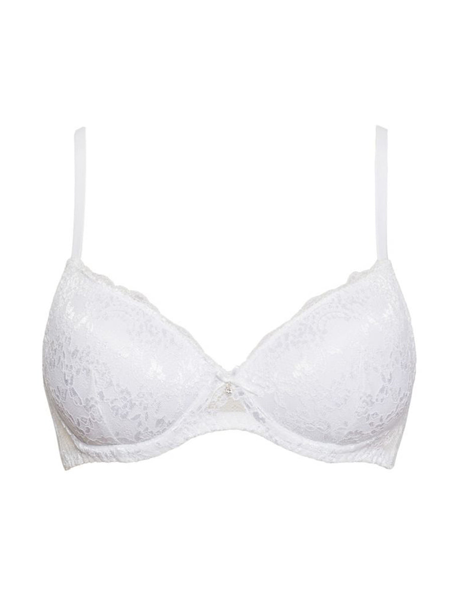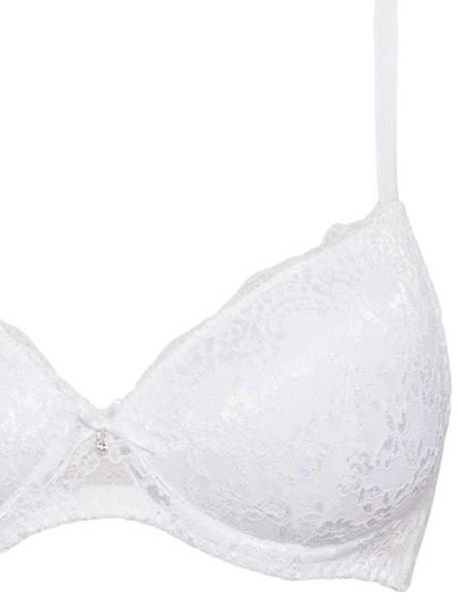 Reggiseno push-up con coppe graduate e senza ferretto, realizzato in raffinata balza di pizzo stretch con cordonetto in rilievo a motivo floreale. Torace e centroseno in laize di pizzo con spalline regolabili. Dettaglio a centroseno di fiocchetto in raso con gioiello e punto luce.