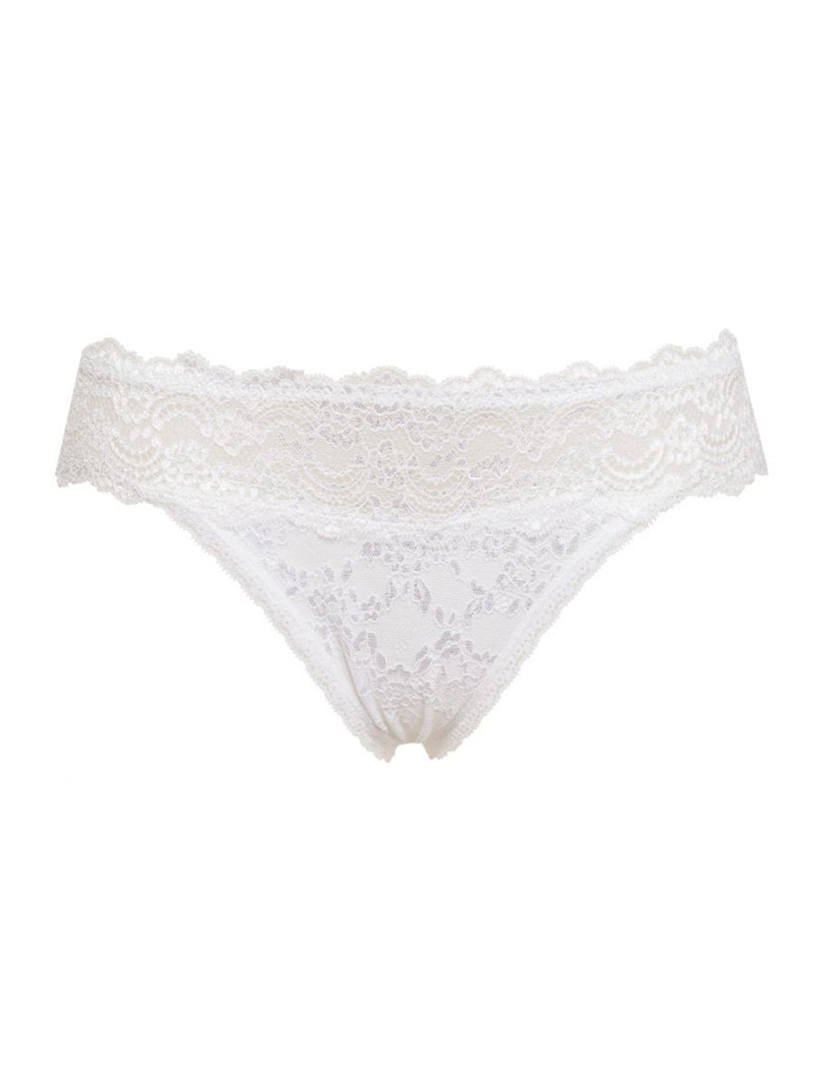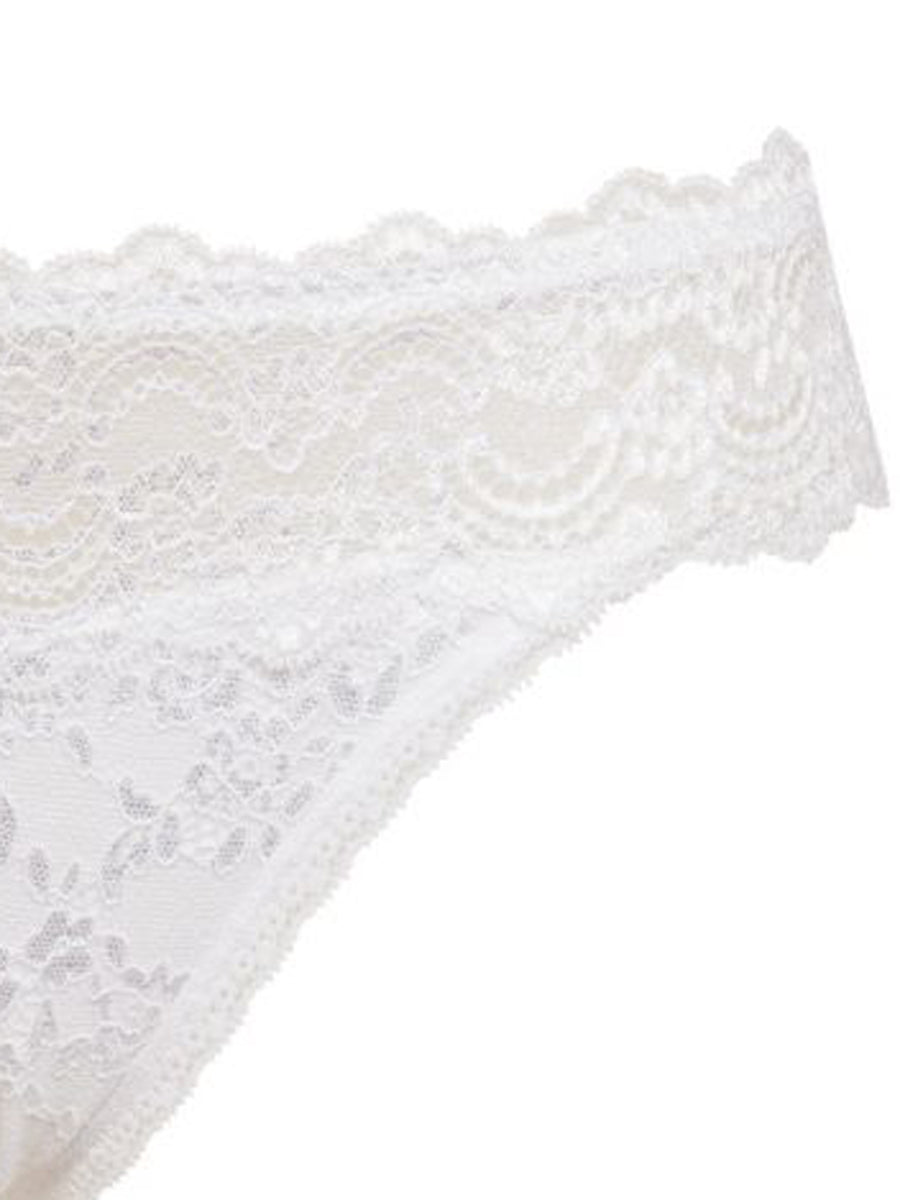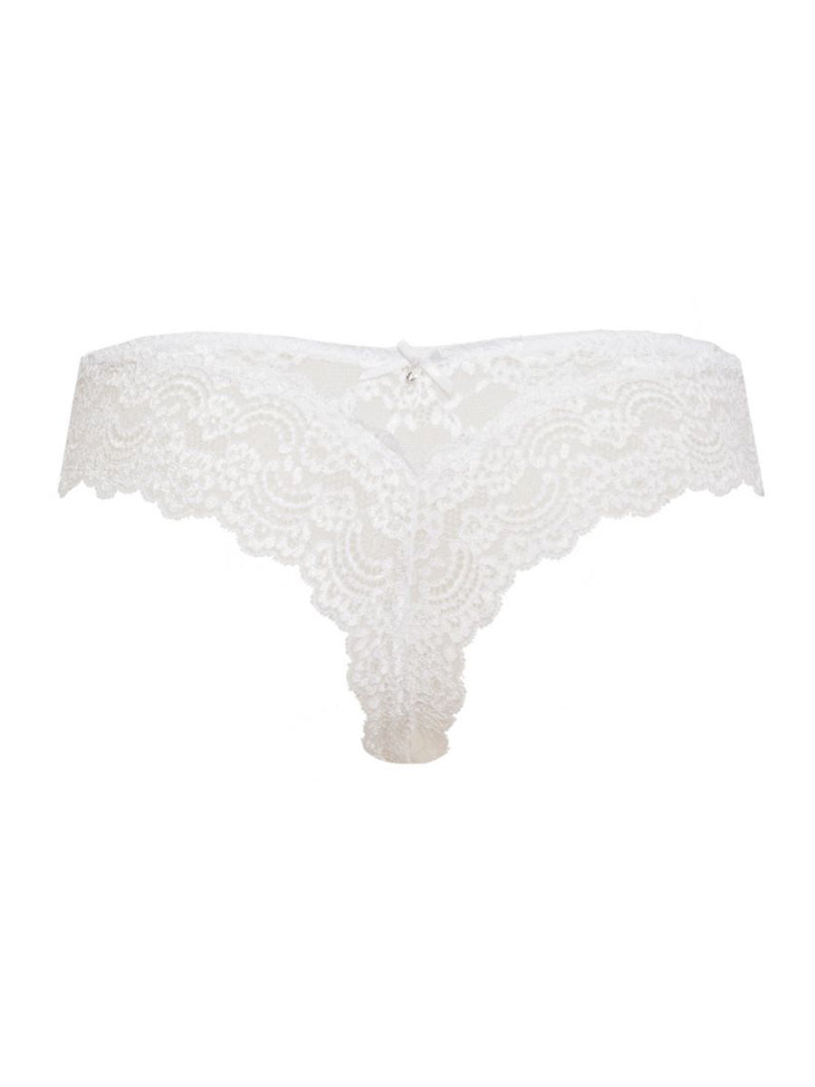 Brasiliana realizzata in raffinata balza di pizzo con cordonetto in rilievo a motivo floreale e impreziosito da un galloncino sempre in pizzo. Dettaglio di fiocchetto in raso con gioiello e punto luce sul retro. Cucitura centrale sul retro per garantire massimo comfort.