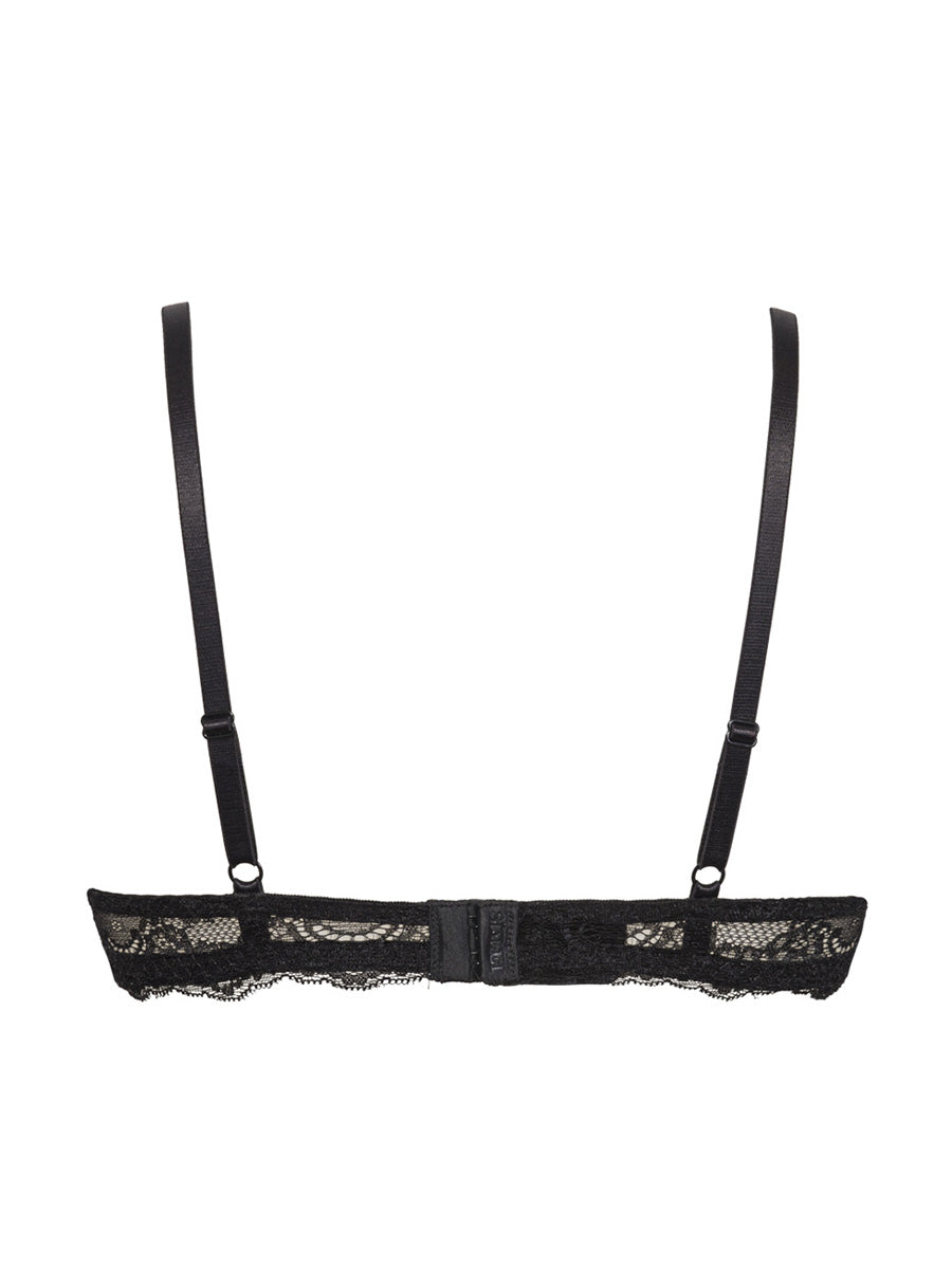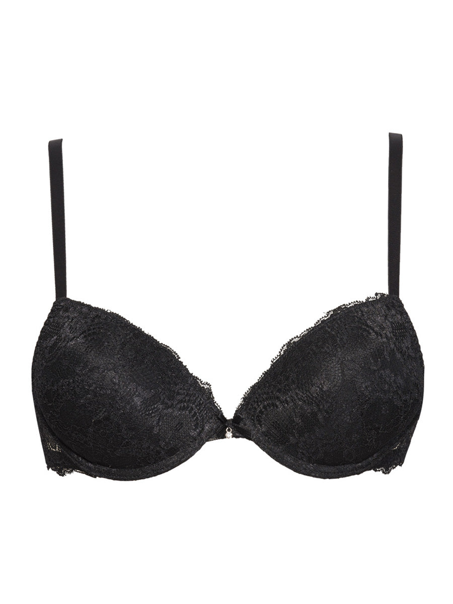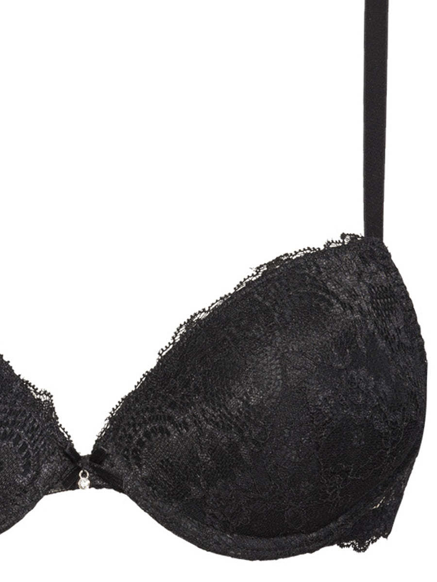 Push-up con ferretto e coppe gel realizzato in raffinata balza di pizzo con cordonetto in rilievo a motivo floreale. Torace in laize di pizzo con spalline regolabili. Dettaglio a centroseno di fiocchetto di raso con gioiello e punto luce.