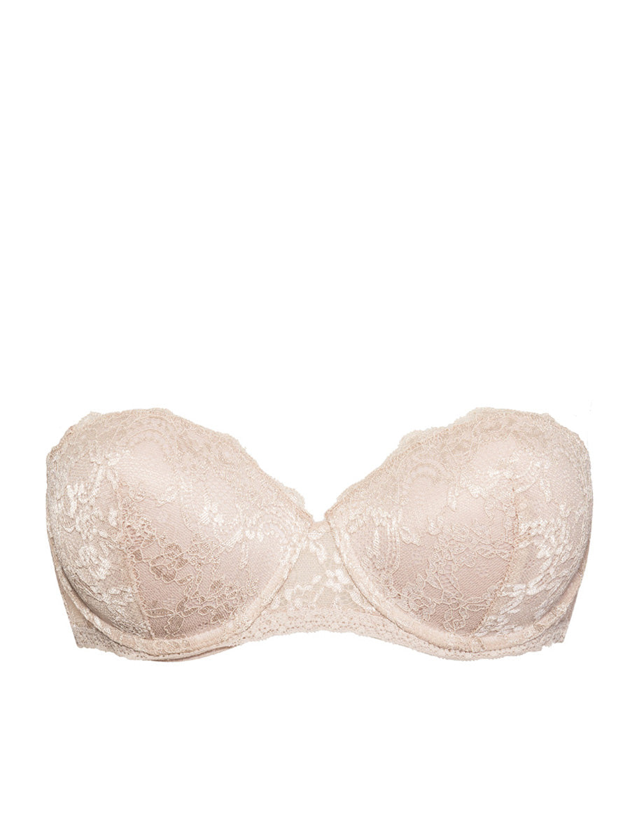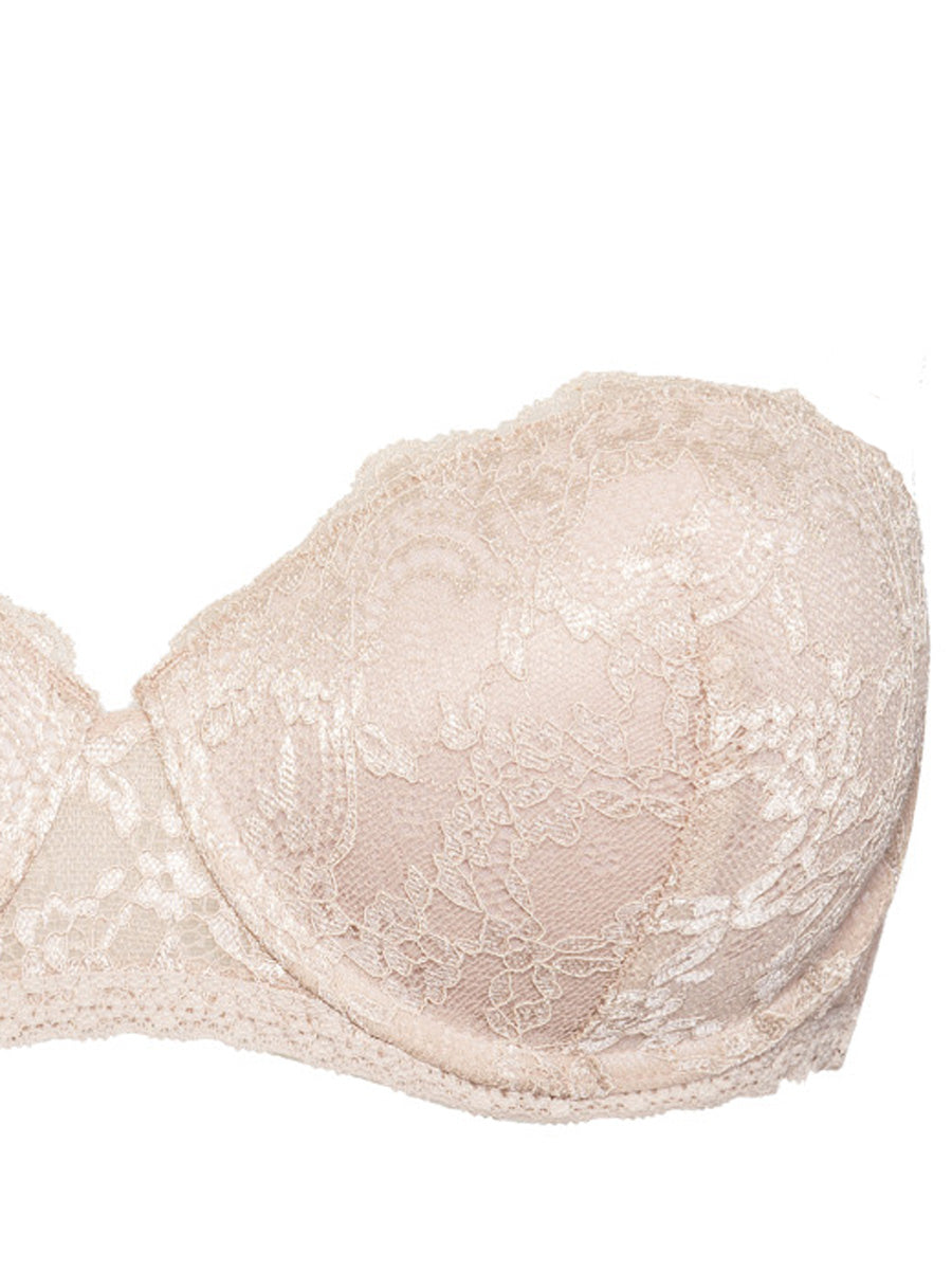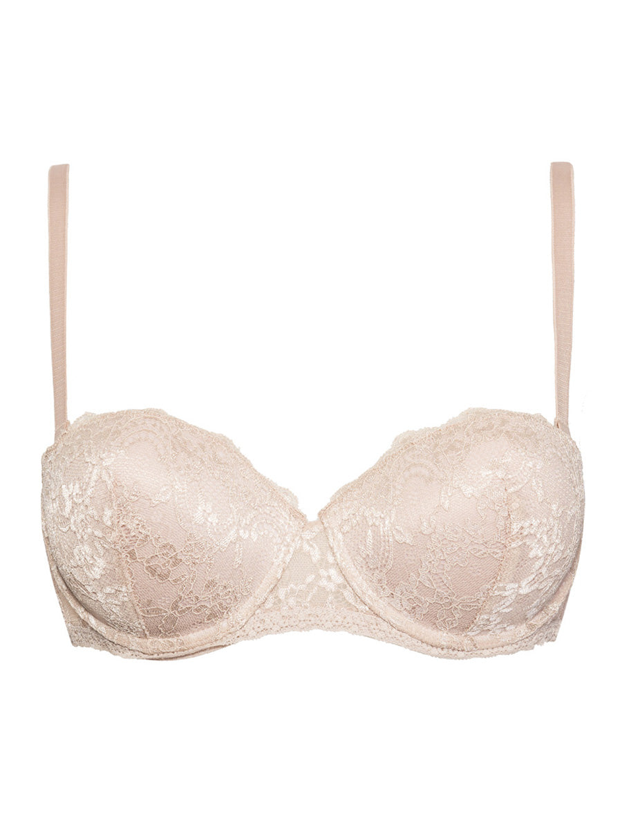 Reggiseno a fascia imbottito con ferretto e coppe graduate. Realizzato in raffinata balza di pizzo con cordonetto in rilievo a motivo floreale. Torace in laize di pizzo e spalline removibili.