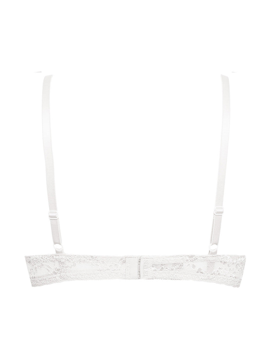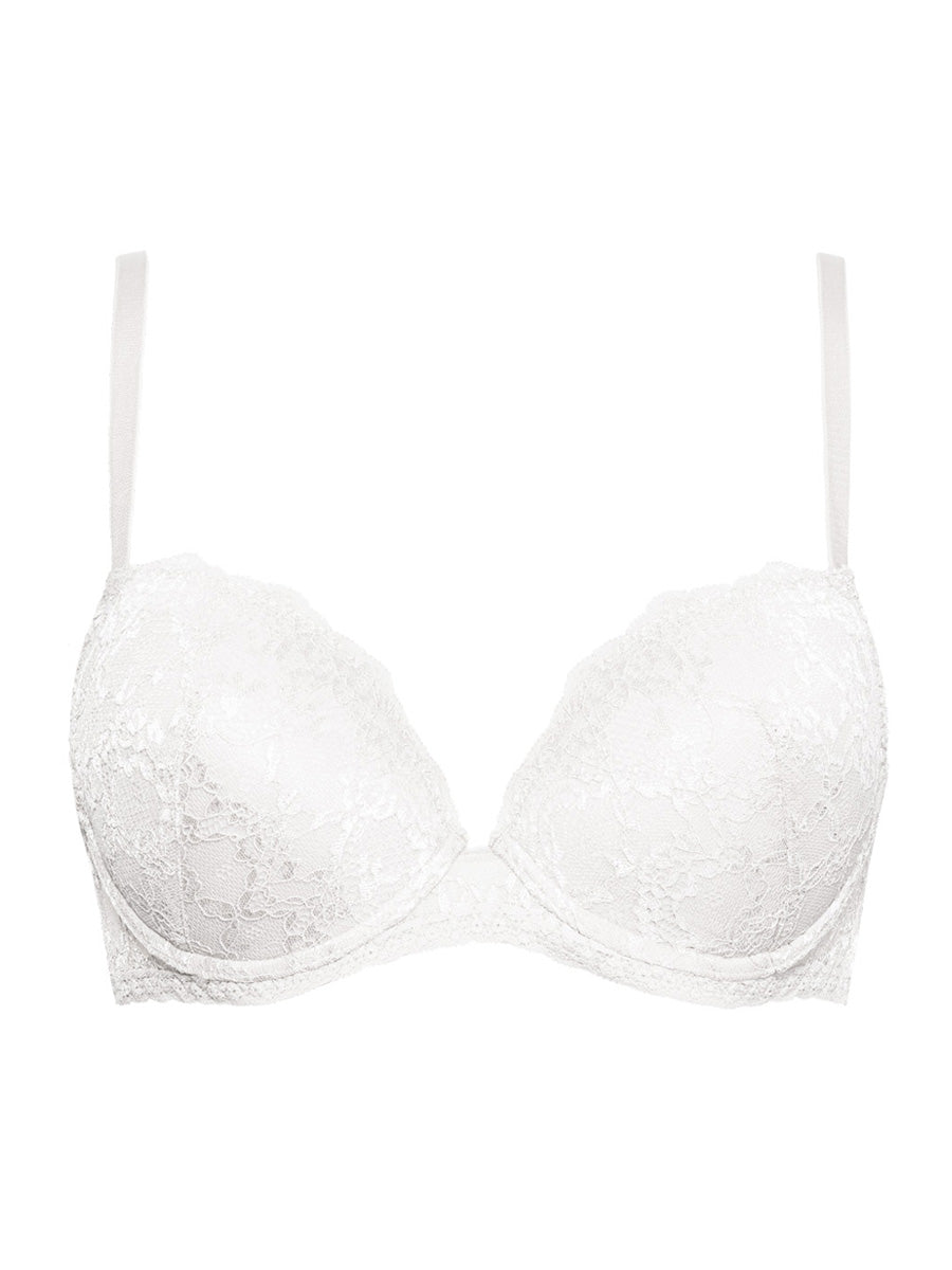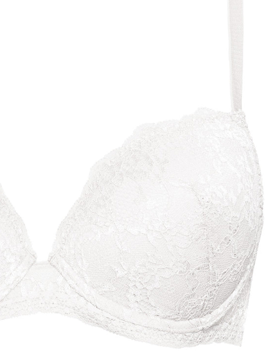 Reggiseno imbottito con ferretto e coppe morbide, realizzato in raffinata balza di pizzo con cordonetto in contrasto a motivo floreale. Torace in laize di pizzo stretch e spalline regolabili.