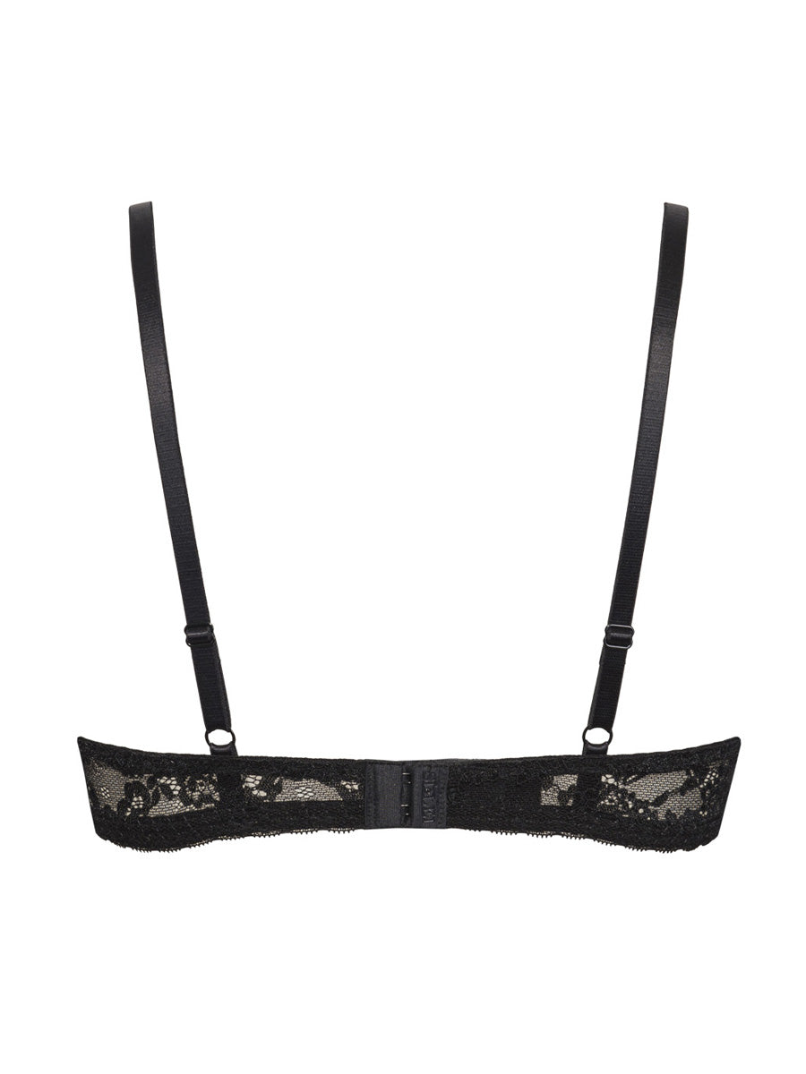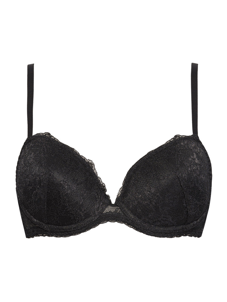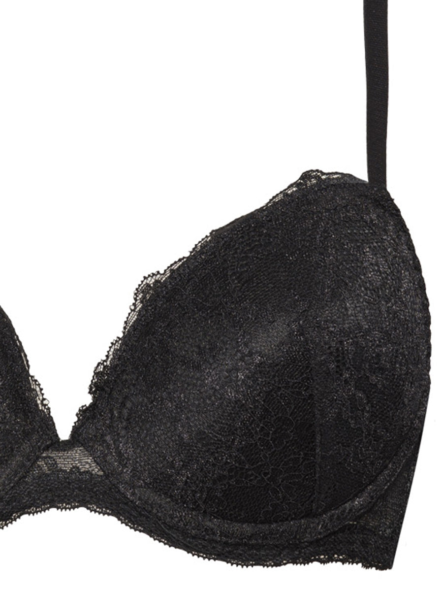 Reggiseno imbottito con ferretto e coppe morbide, realizzato in raffinata balza di pizzo con cordonetto in contrasto a motivo floreale. Torace in laize di pizzo stretch e spalline regolabili.