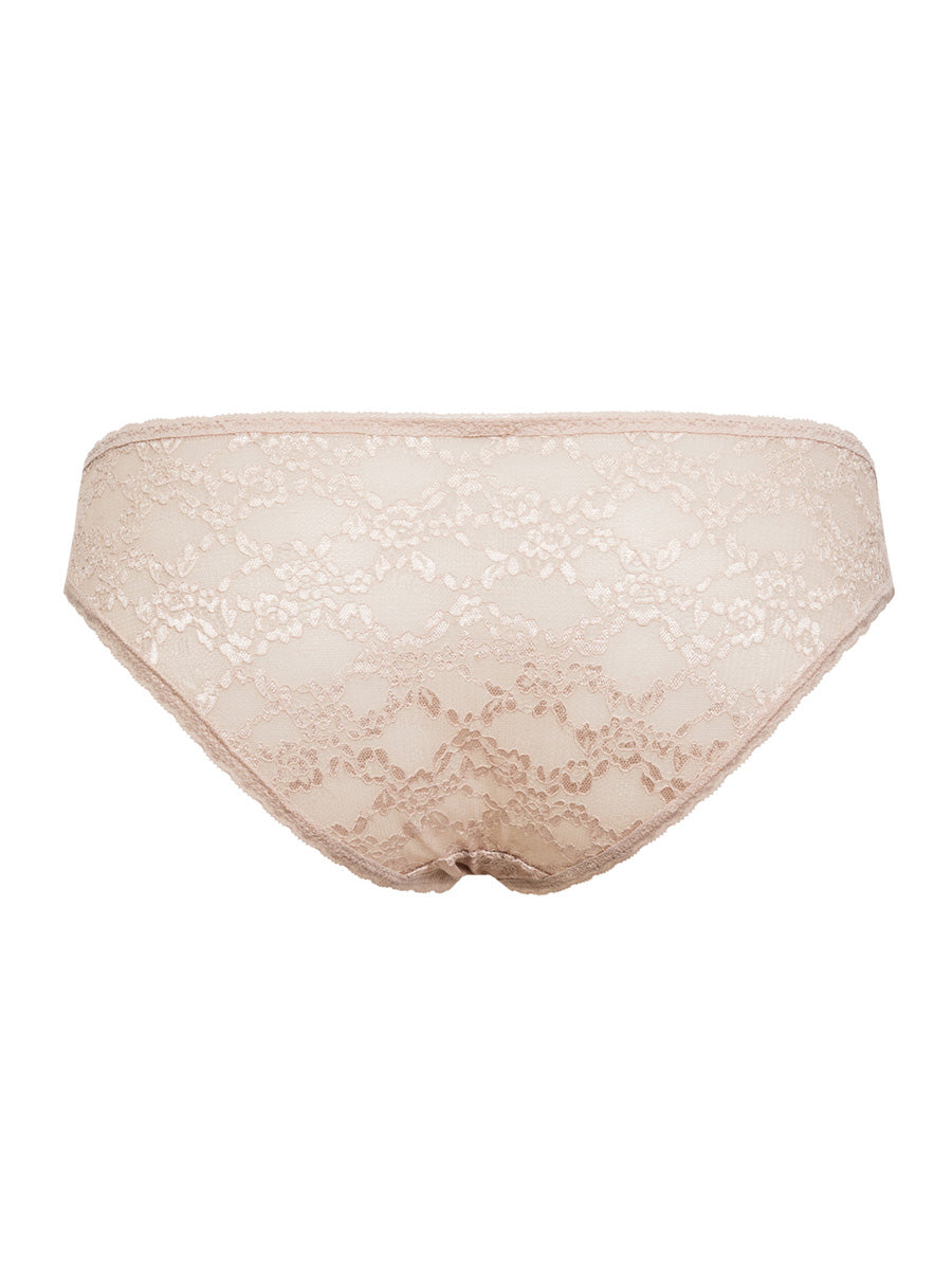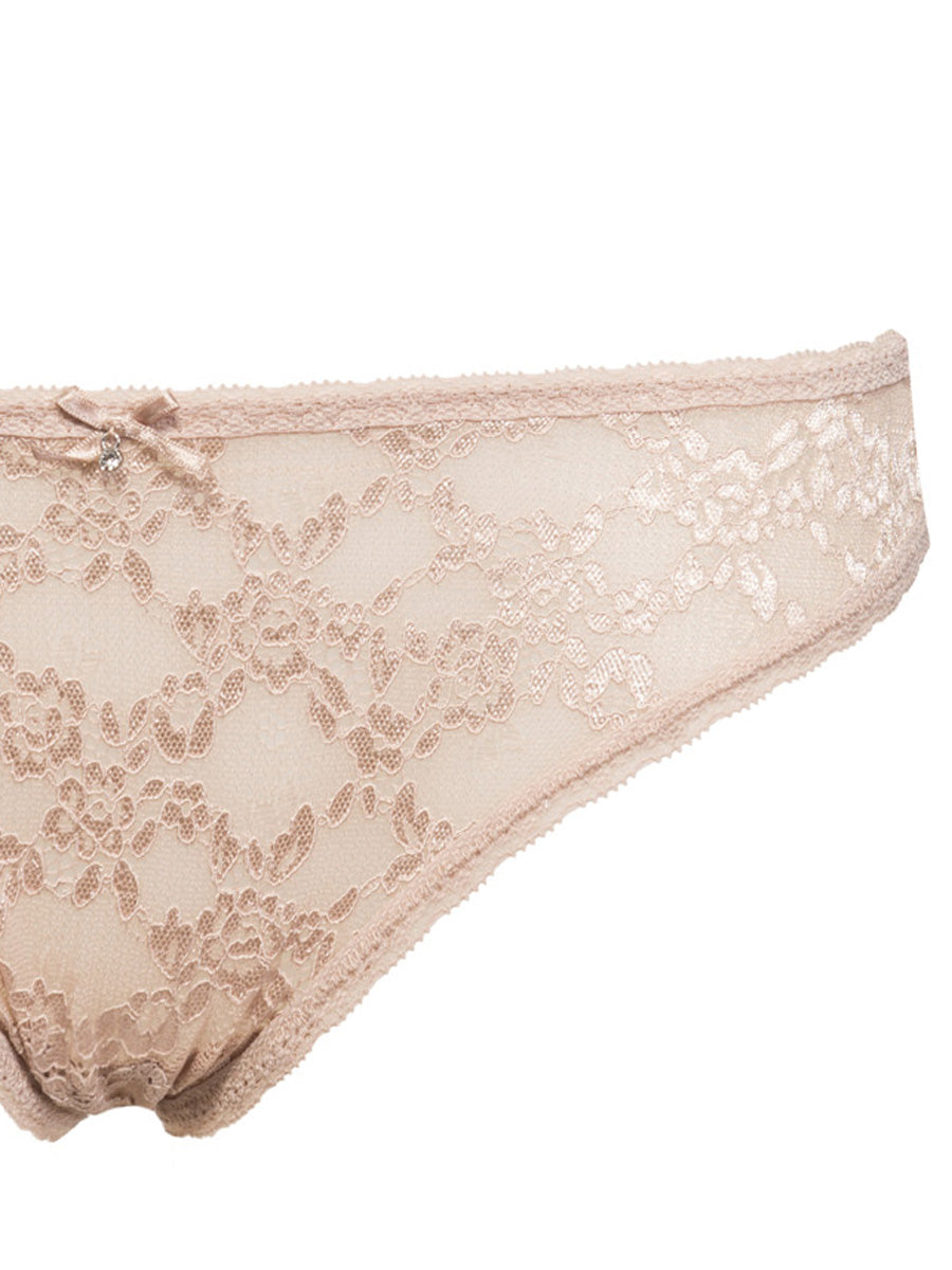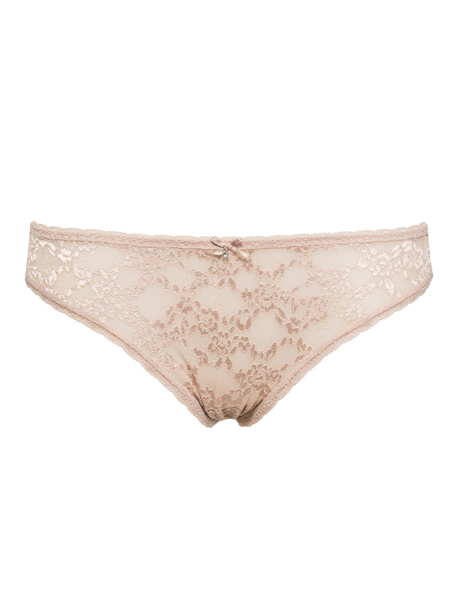 Slip alto realizzato in raffinata balza di pizzo con cordonetto in rilievo a motivo floreale. Dettaglio di fiocchetto in raso e gioiello con punto luce.