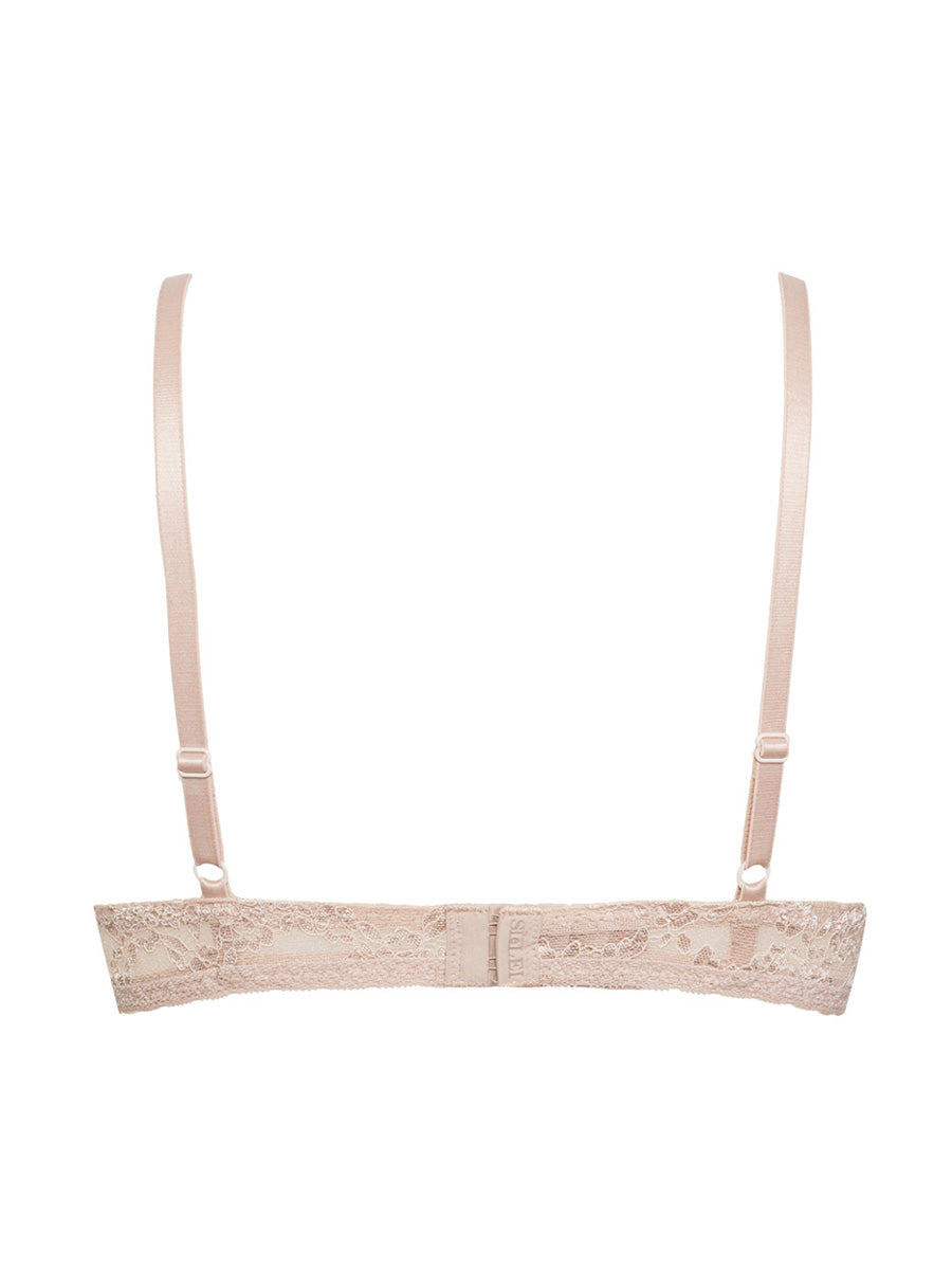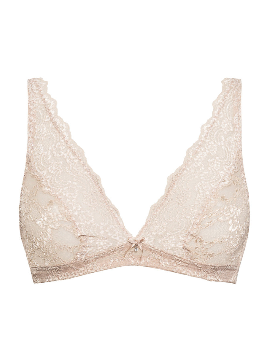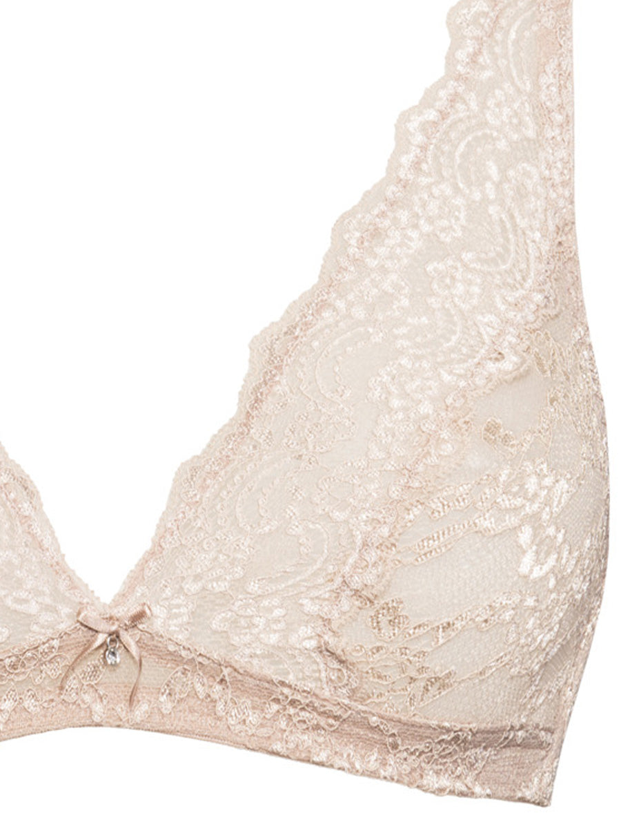 Reggiseno a triangolo senza ferretto realizzato in raffinato laize di pizzo stretch con cordonetto in rilievo a motivo floreale e impreziosito da un galloncino sempre in pizzo. Malizioso gioco di trasparenze e cuciture diagonali sulle coppe per garantire massima vestibilità. Dettaglio a centroseno di fiocchetto in raso e gioiello con punto luce.