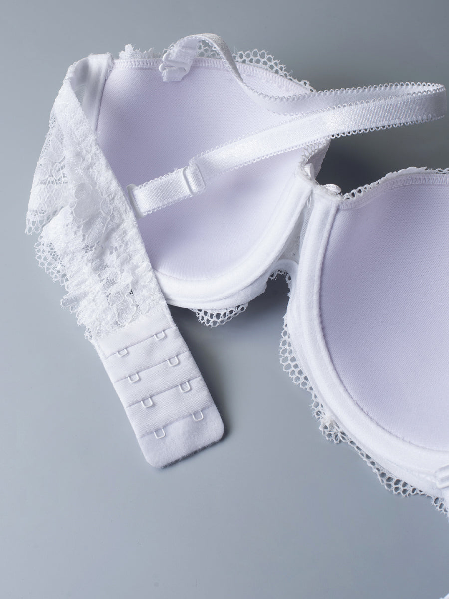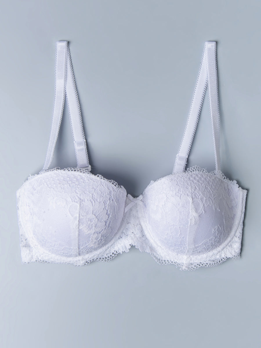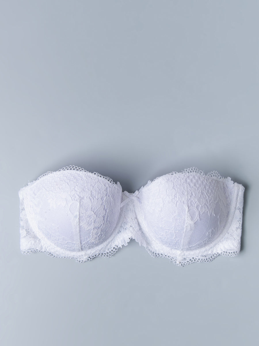 Fascia interamente realizzata in pizzo con coppe imbottite, ferretto e spalline removibili. Modello con stecche laterali e profili in silicone per assicurare ottima vestibilità anche senza spalline.